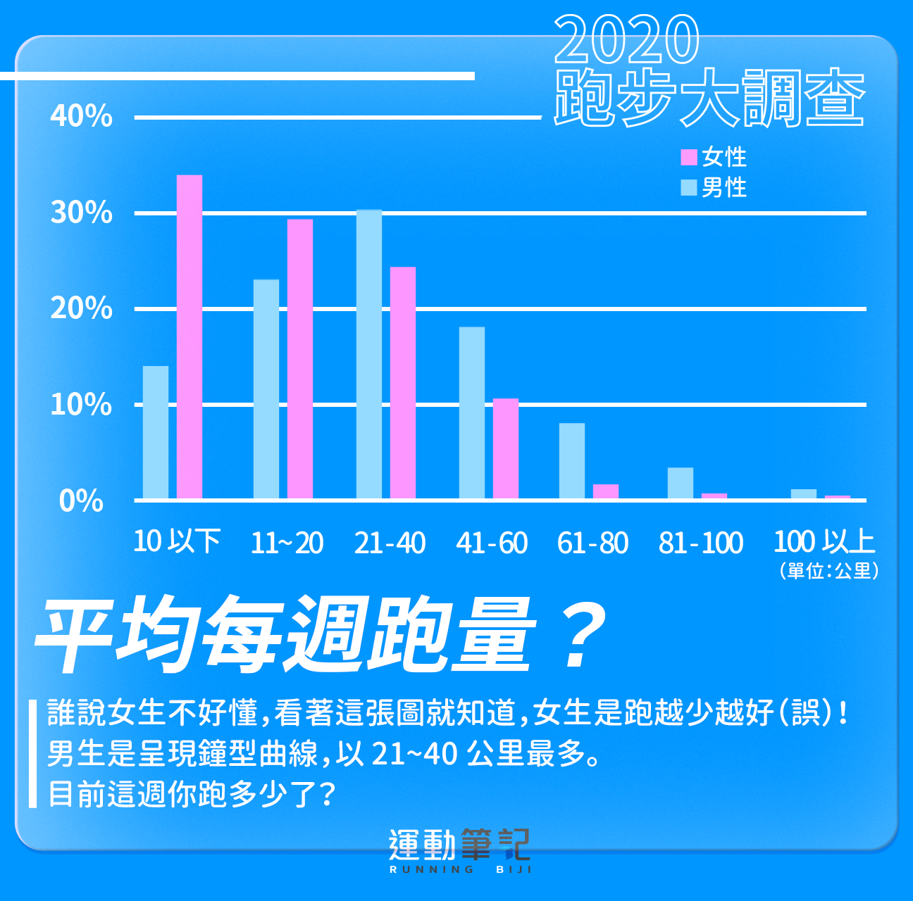在週跑量的部分,男女也有明顯的差異,男生呈現鐘形曲線,以每週 21~40 公里最多(30%),其次是 11~20 公里(24%),再來是 41~60 公里(18%);女生則是依照公里數增加而認數減少,每週 10 公里以下的最多(32%),誰說女生不好懂(笑)。