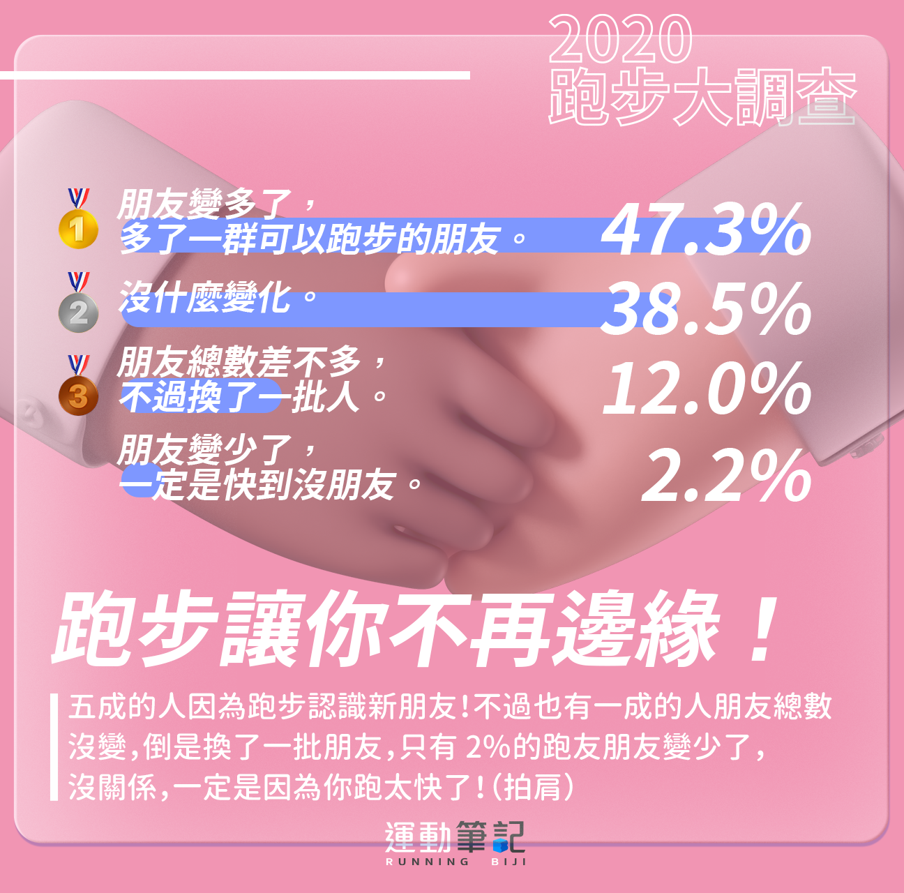跑步真的可以認識新朋友嗎?根據 2020 跑步大調查,將近五成的人因為跑步認識新朋友!不過也有一成的人朋友總數沒變,倒是換了一批朋友,只有 2%的跑友朋友變少了,沒關係,一定是因為你跑太快了!(拍肩)