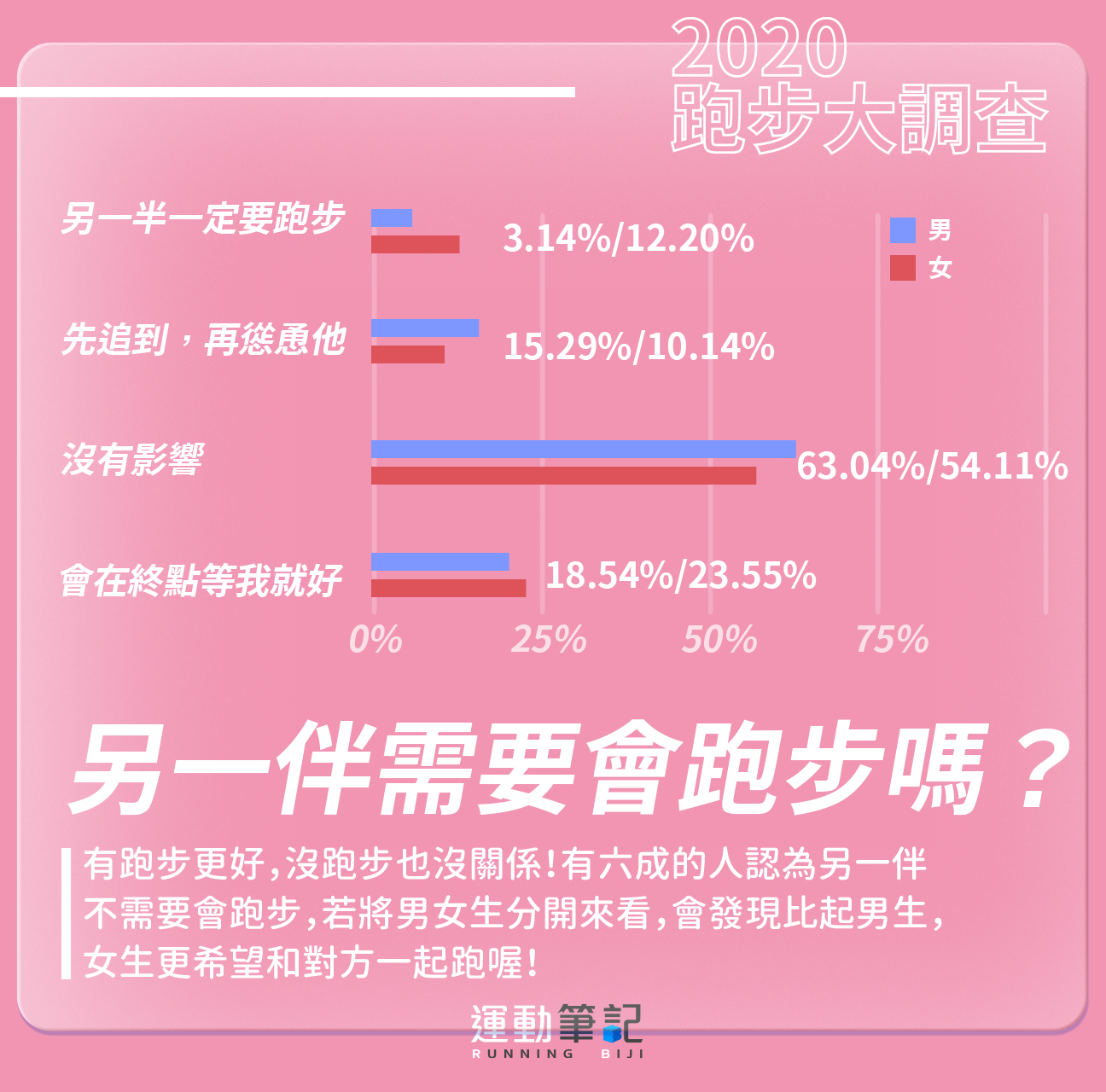 選擇「另一半一定要跑步」的男生只有 3.1%,不過女生則有 12.2%;選擇「會在終點等我就好」的男性有 18.5%,女生略高有 23.5%。唯一只有「先追到了再慫恿他/她去跑步」這個選項,男生選擇的比例較女生多。