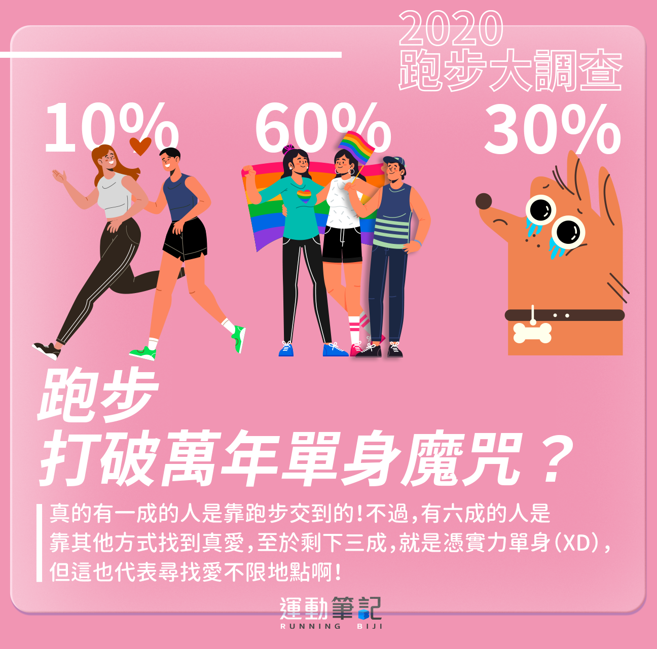 調查顯示,約有一成的人是真的靠跑步交到的!有六成的人不是靠跑步交到的,至於剩下三成,就是憑實力單身的一群人XD,不過這也代表天涯何處無芳草,除了田徑場或河濱之外,還有許多地方可以尋覓真愛的!
