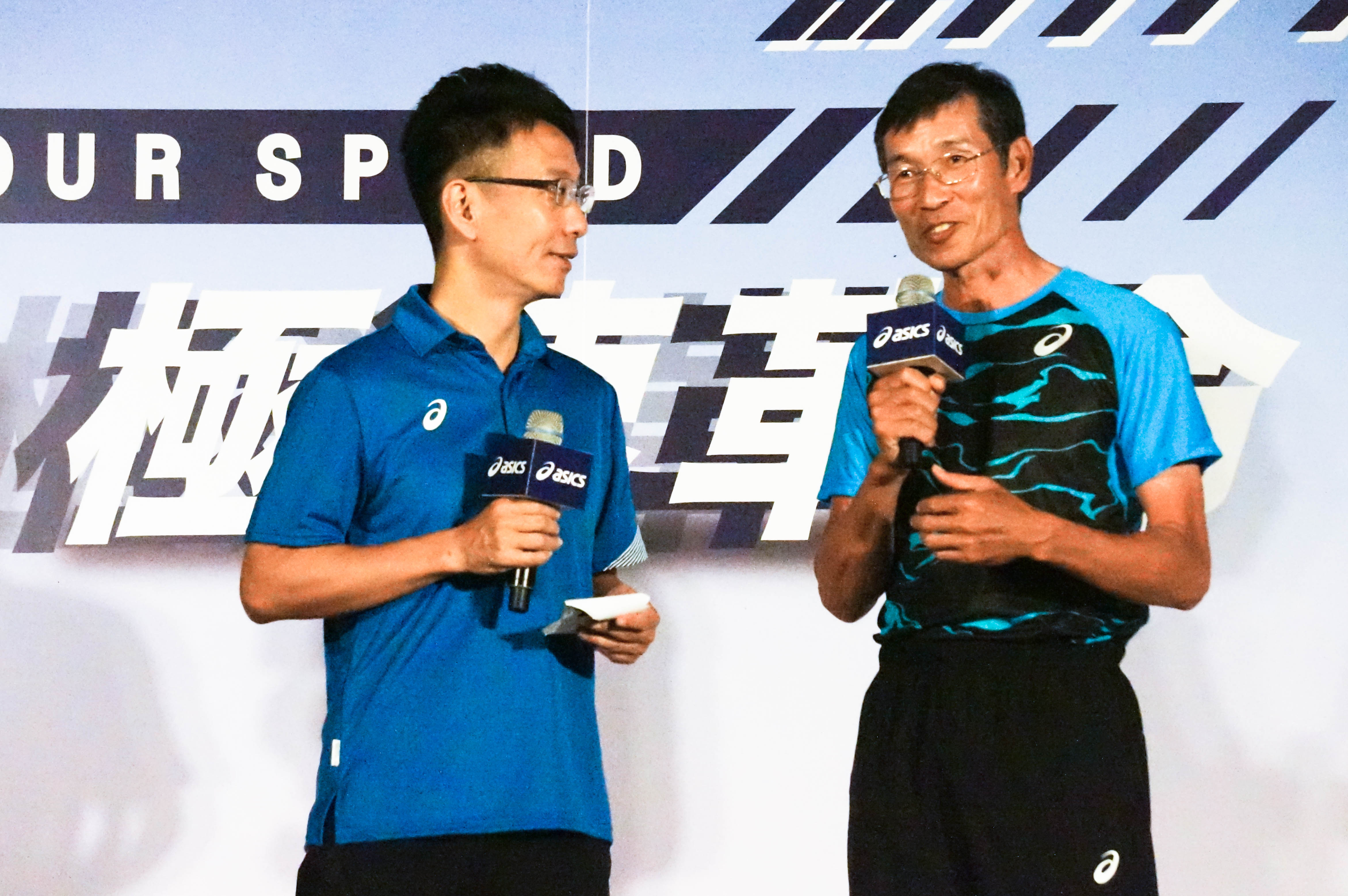 主持人「魁哥」田鴻魁(左)笑說要是這雙鞋早 30 年出來,許績勝老師(右)創下的全國馬拉松紀錄會更快!