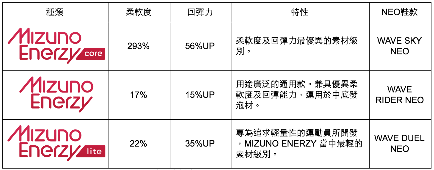 因應不同的鞋款定位,ENERZY 中底分為三大種類,由表格可窺知一二,ENERZY lite 較偏向競速鞋款且重量較輕,如 Wave Duel Neo ;ENERZY core 則是用量最豐厚,以頂級避震的 Wave Sky Neo 為代表,適合剛入門或尋求無傷完賽的跑友們;本篇的主角 Wave Rider Neo 則是採用上下兩層全中底 ENERZY 材質,在重量與功能(柔軟、回彈)達到巧妙的平衡,且搭配 MIZUNO 最引以為傲的 Wave 波浪片技術,在既有的避震緩衝之下,提供舒適、柔軟的 ENERZY 中底提升穿著感受。