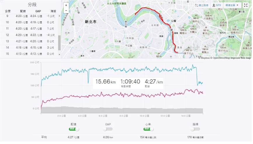 Wave Rider Neo 襪套式鞋面在足跟杯的包覆感很好,在稍具速度的漸速長跑提供腳踝穩定的保護與支撐,面對偶爾並排騎乘的U-Bike,選擇超車或快速變換跑步方向時,心裡面比較安定。此次河濱跑步北至馬場町,南至景美橋,距離 15.6 公里。