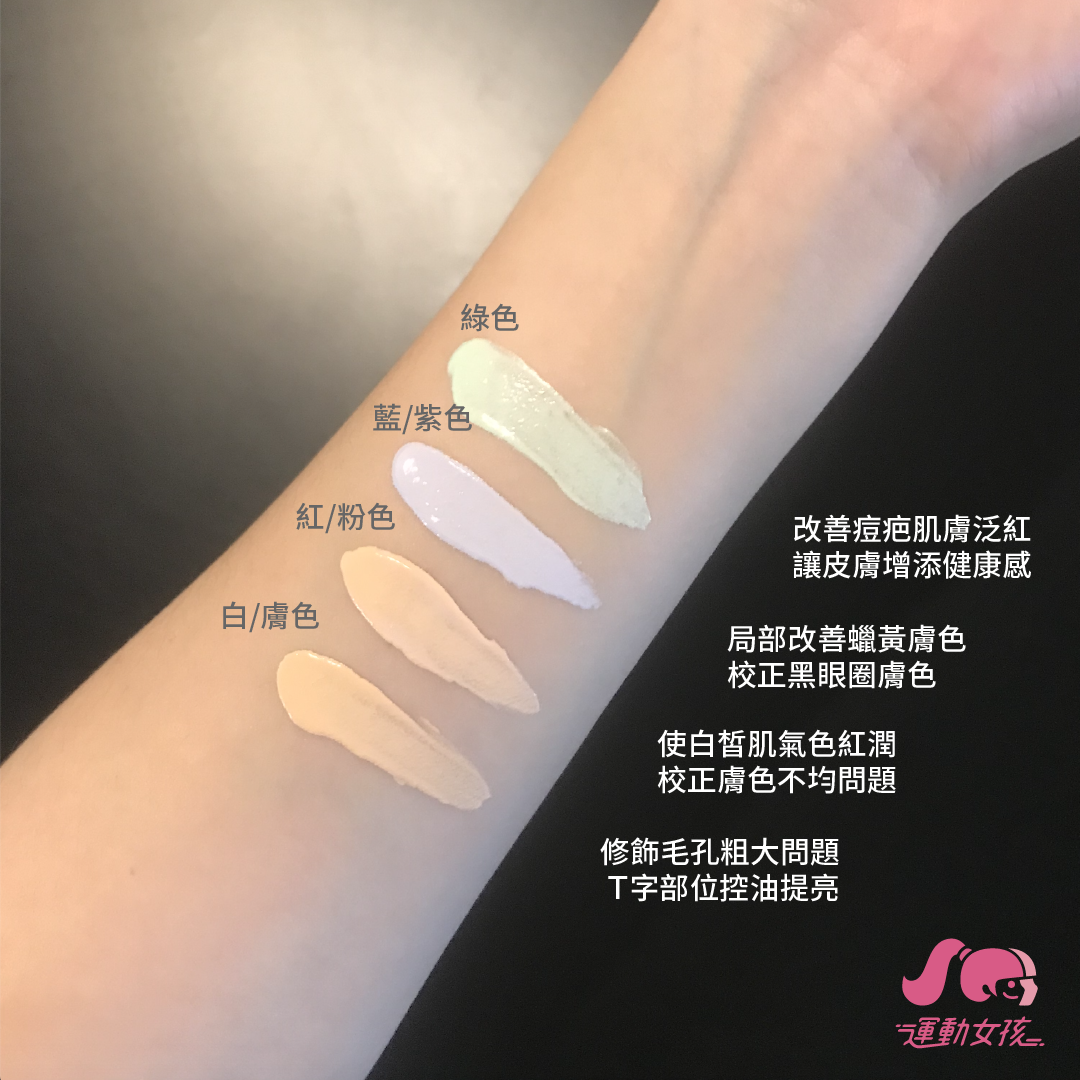 通常分為白色、藍/紫色、綠色、及紅/粉色四種,可以依照自己膚色問題,選擇互補色的潤色隔離霜,對你的肌膚問題加以調整,讓素顏的讓氣色看起來更好!