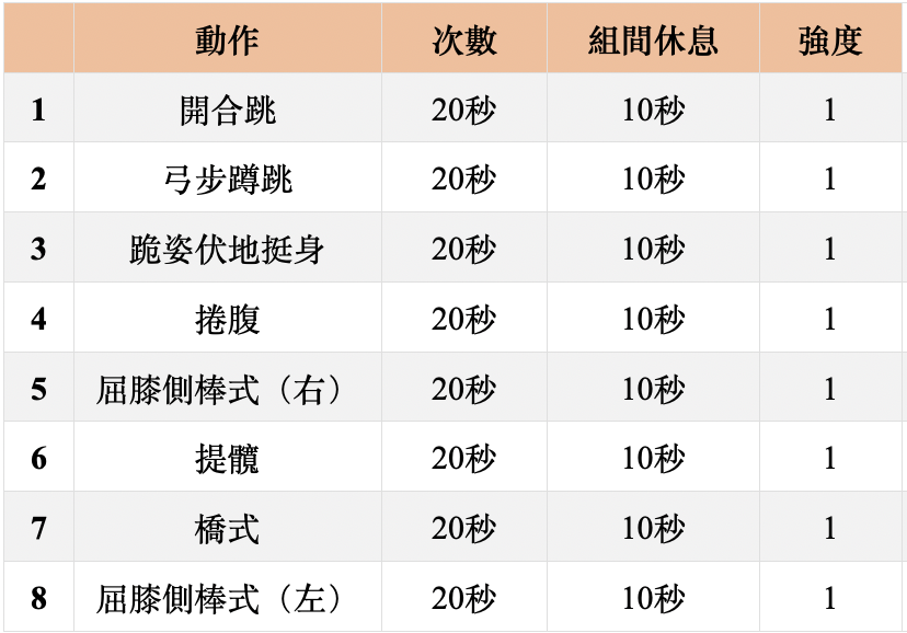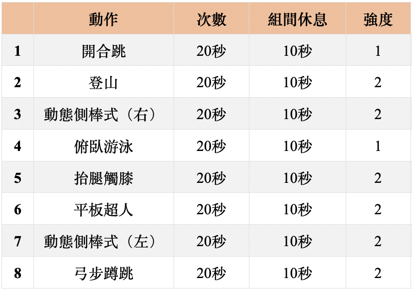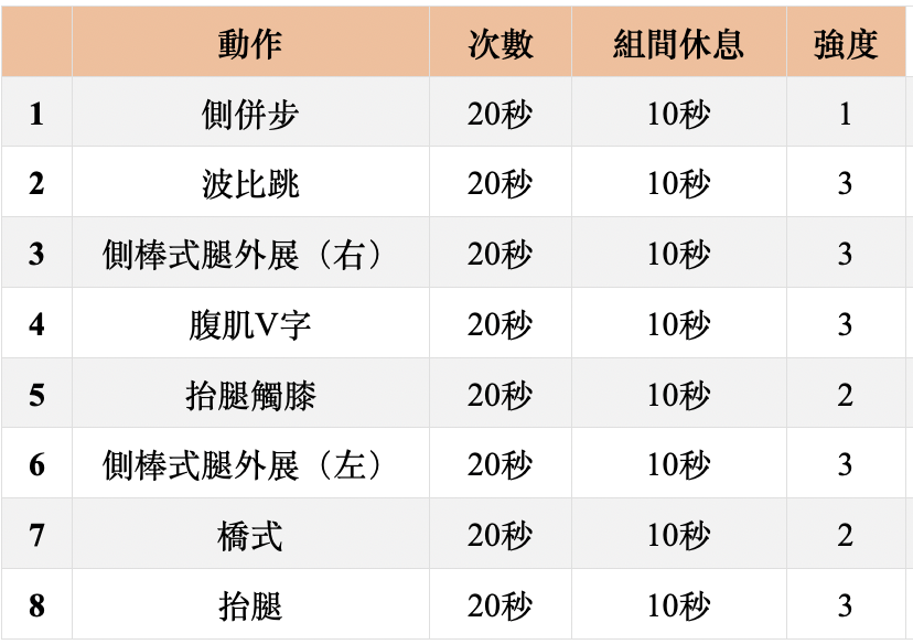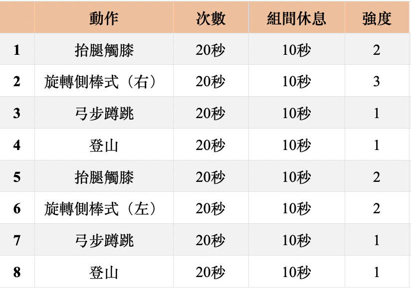 - 訓練模式:Tabata/中階 2 循環,高階 4 循環