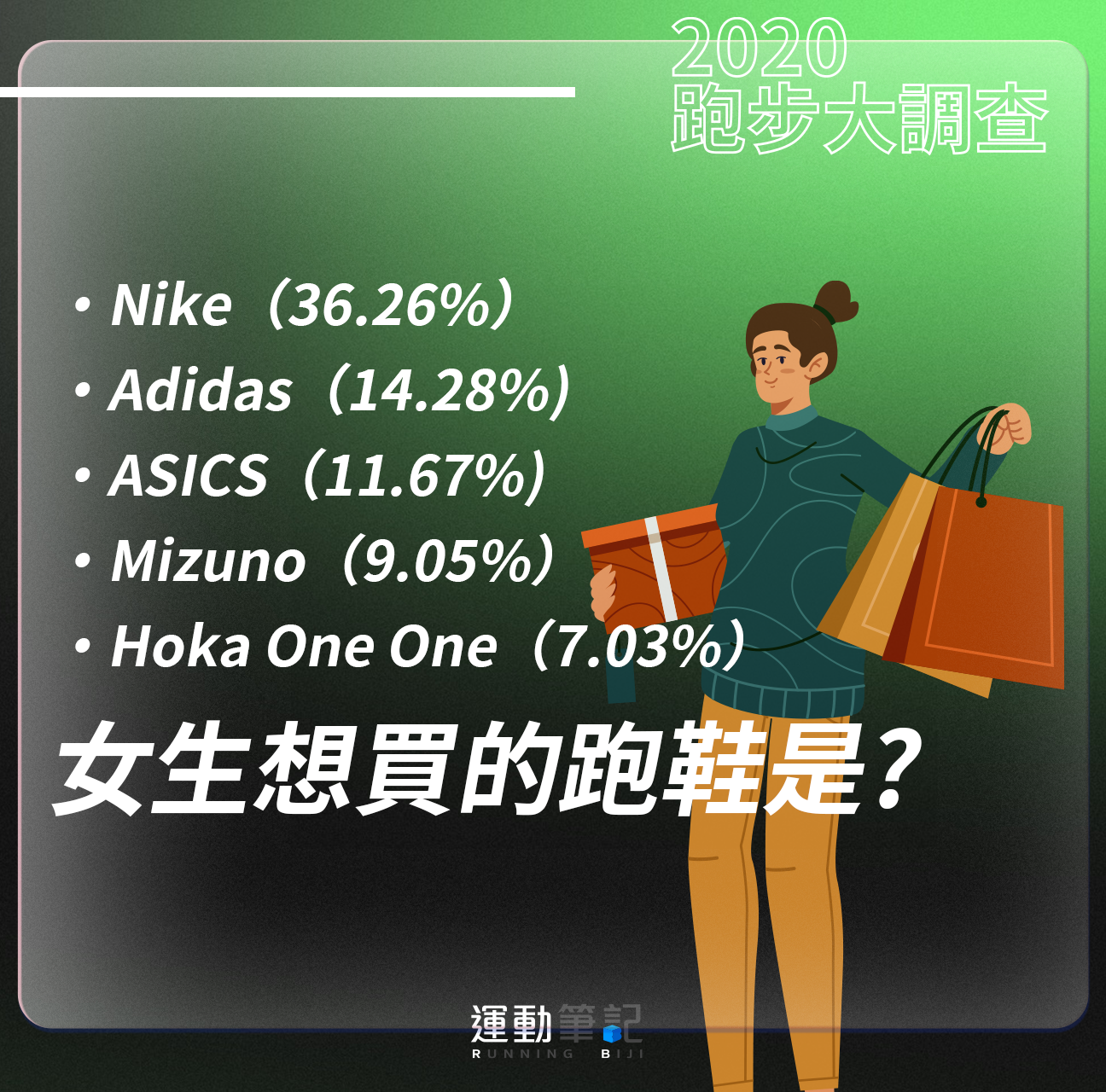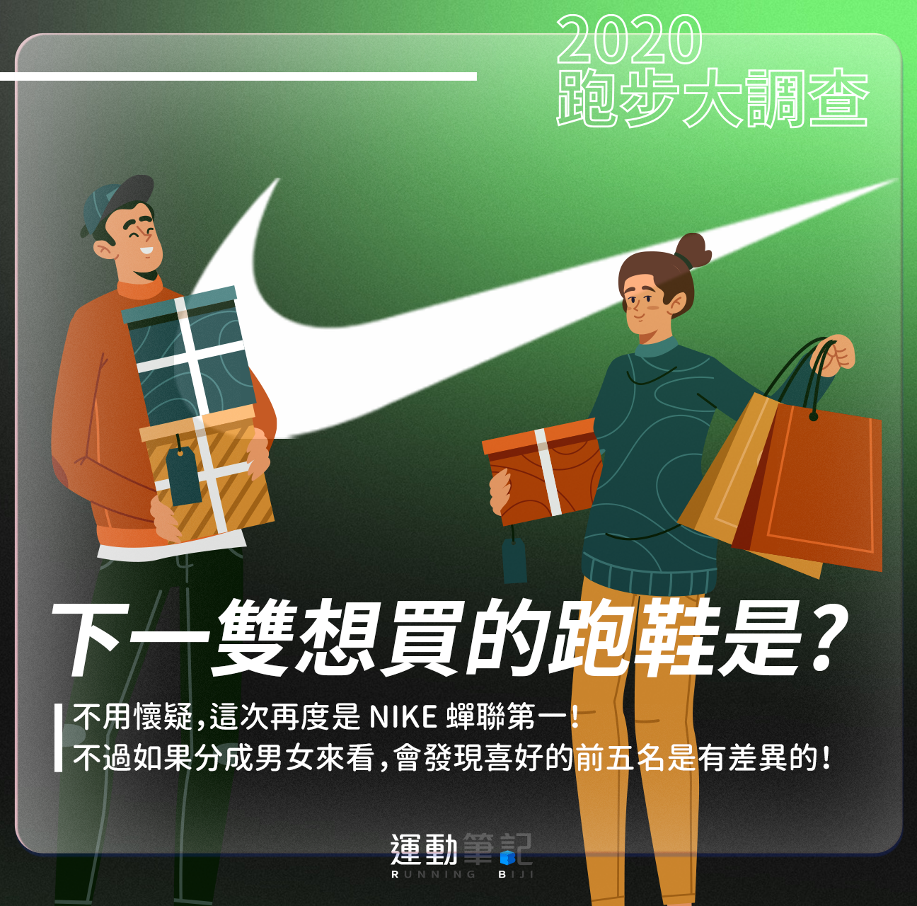 接著,就要來問大家下一雙想買的跑鞋品牌是......?不用懷疑,這次再度是 NIKE 蟬聯第一,不論男女皆是,而且相較 2019 年比例還增加。