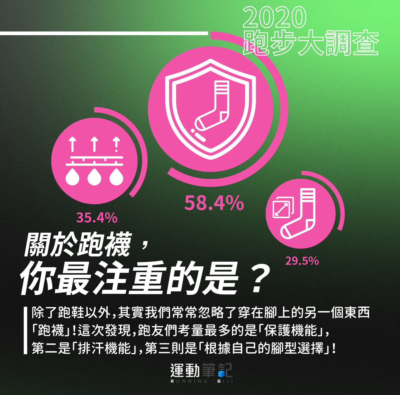 除了跑鞋以外,其實我們常常忽略了穿在腳上的另一個東西--「跑襪」!這次調查了跑友們選擇跑襪會注重哪些因素,發現最多人考量的是「保護機能」(58.4%),第二多是「排汗機能」(35.4%),而第三則是「根據自己的腳型選擇」(29.5%)!