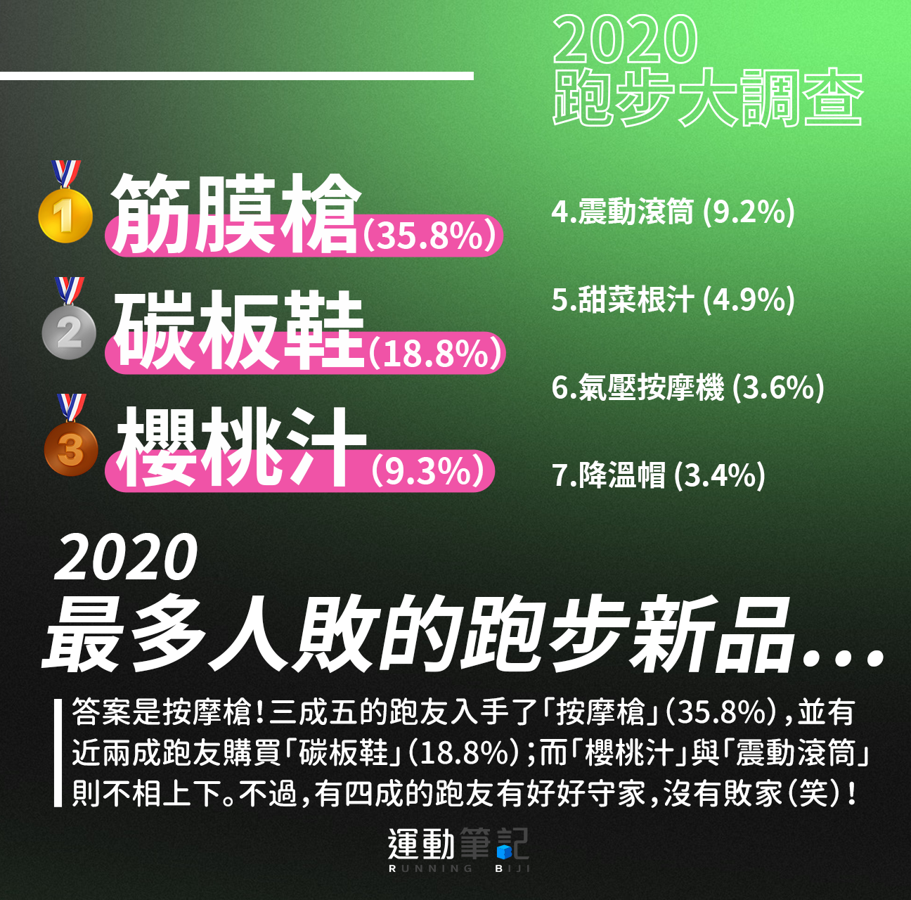 答:按摩槍!有三成五的跑友入手了按摩槍(35.8%),接著是近兩成的跑友購買碳板鞋(18.8%);而櫻桃汁(9.3%)與震動滾筒(9.2%)則不相上下。不過,也是有四成的跑友有好好守家,沒有敗家啦(笑)!