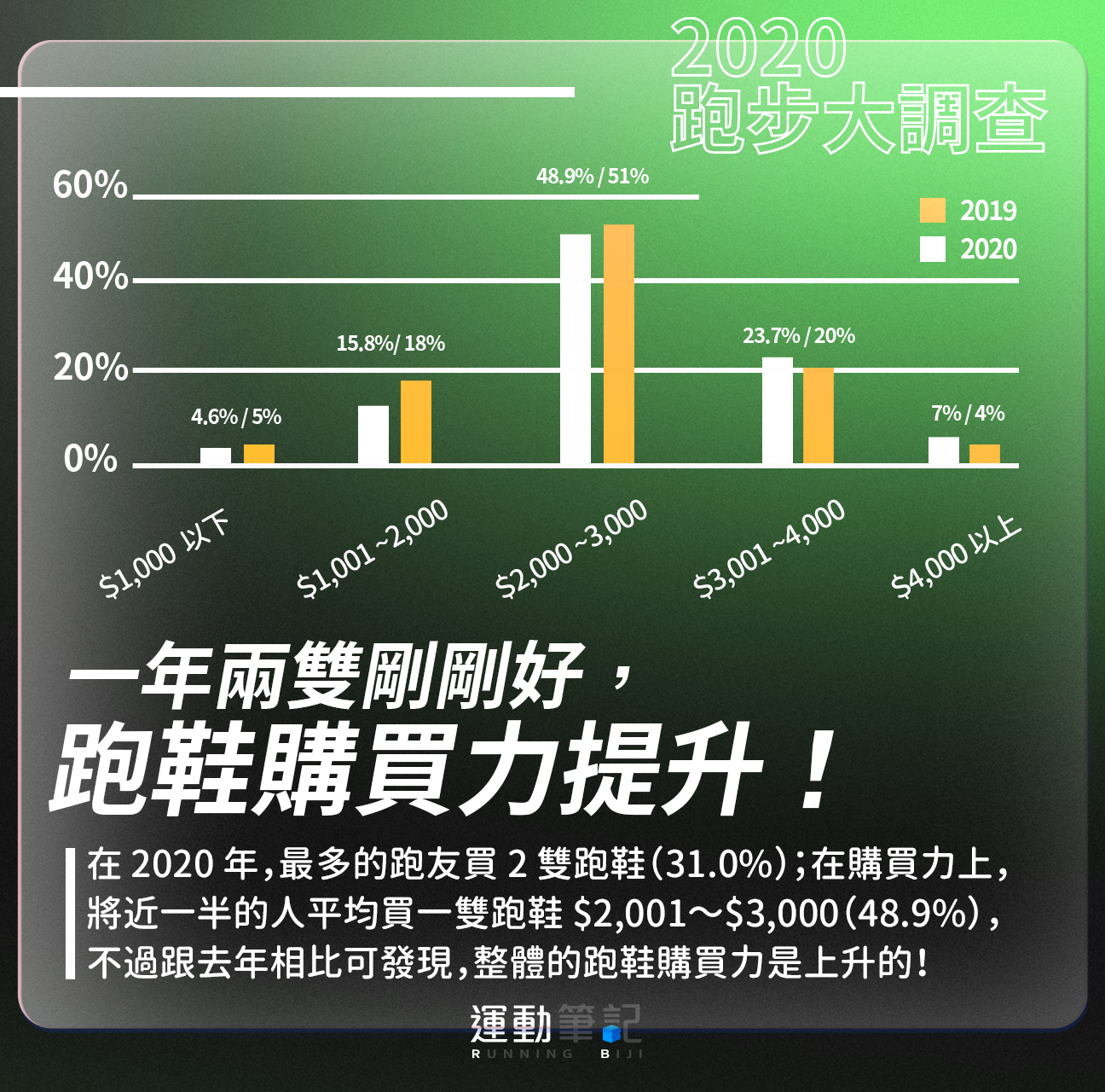 值得注意的是,跟 2019 年相比,平均購買一雙跑鞋價格落在中價位以下($3,000 以下)的跑友是下降的,而中高價位($3,001 以上)從 2019 年的 24.0% 上升到 30.7% ,整體的跑鞋購買力是逐年上升的。看來,為了在馬場上不腳軟,必須花錢不手軟啊!