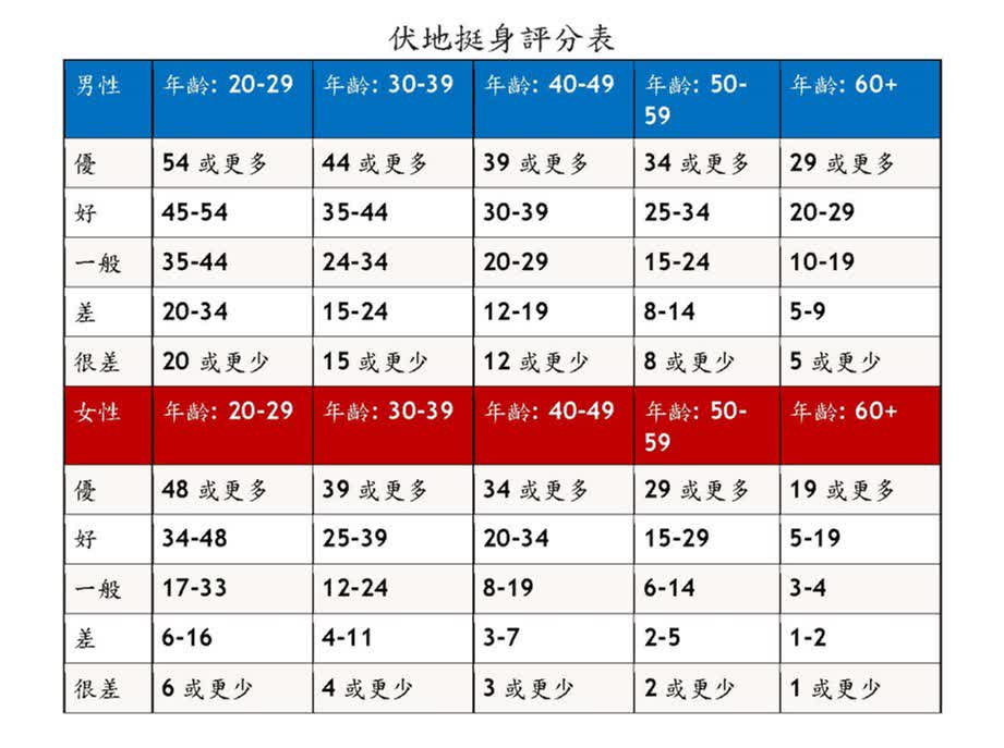 完成測試後,將結果與年齡和性別的規範和建議進行比較。為了評估你的訓練進度,你可以每 8~12 週進行一次伏地挺身測試。