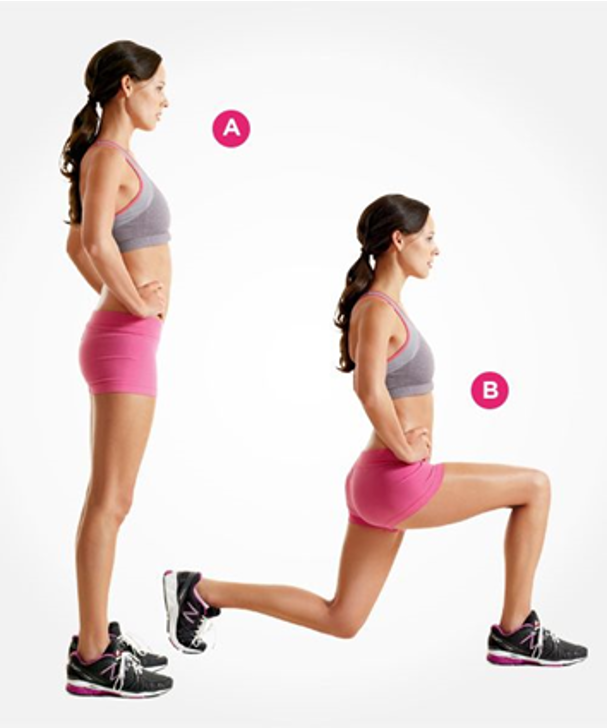- 當你往前跨出一隻腳時,核心出力並將手擺在髖部位置。前腳屈膝直到 90 度角的姿勢。確保你的膝蓋沒有超過腳尖。