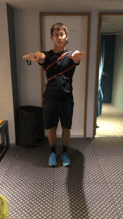 - 活動方向水平的往身體外側帶,這時候記得不要聳肩,也不要刻意轉動身體,單純地轉動肩膀,除了往外旋的動作要用力,回來的動作也需要穩定身體。