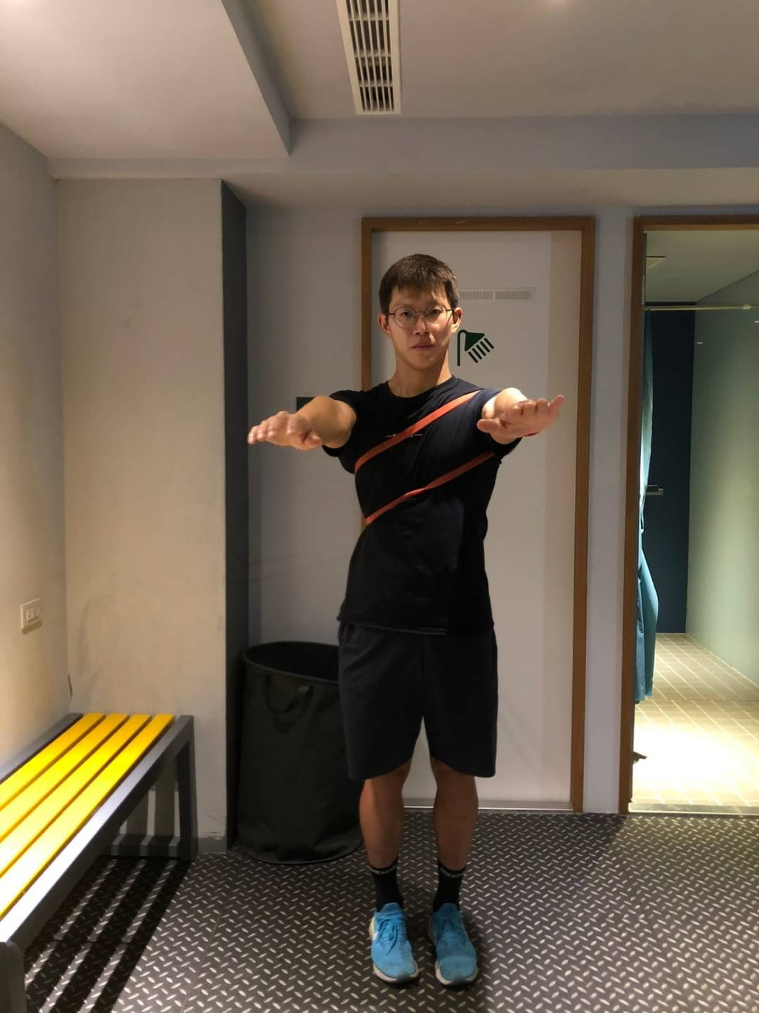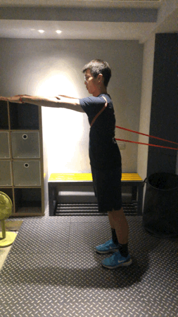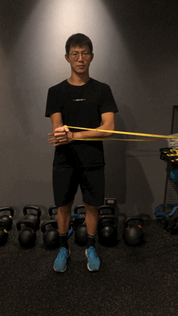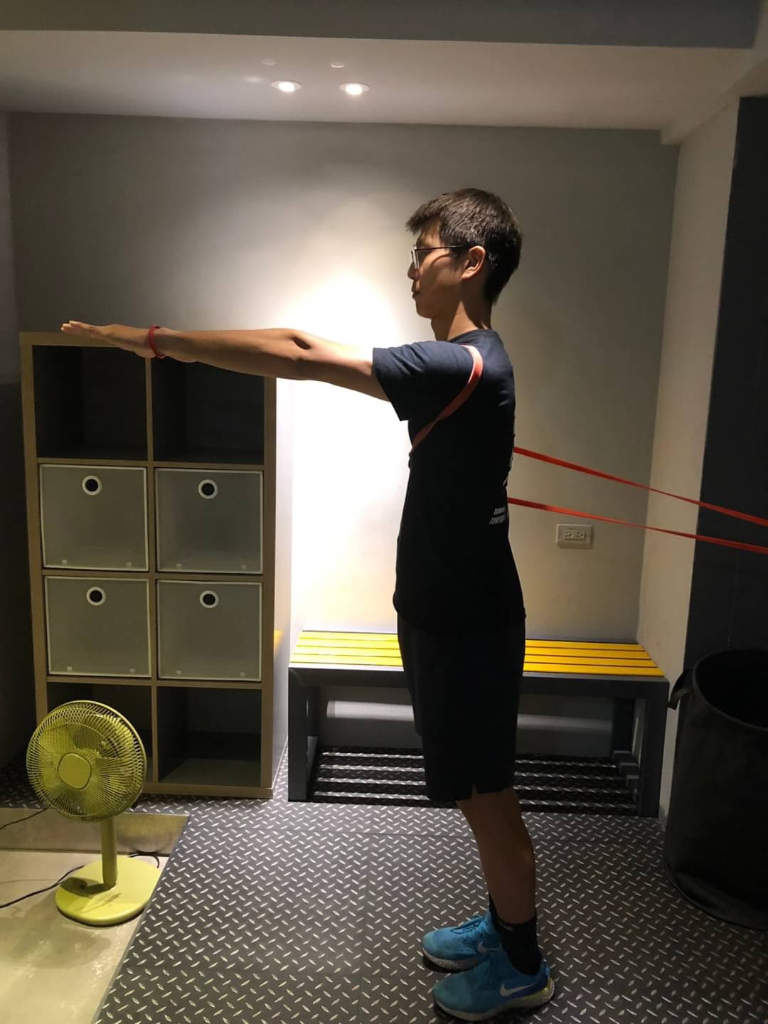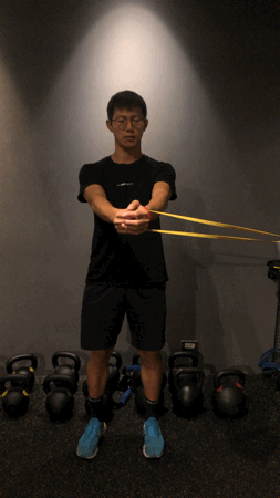 - 保持身體直立,將手肘伸直舉起與肩同高,雙手抓住彈力帶,起始位置手臂至於胸前平行地面。