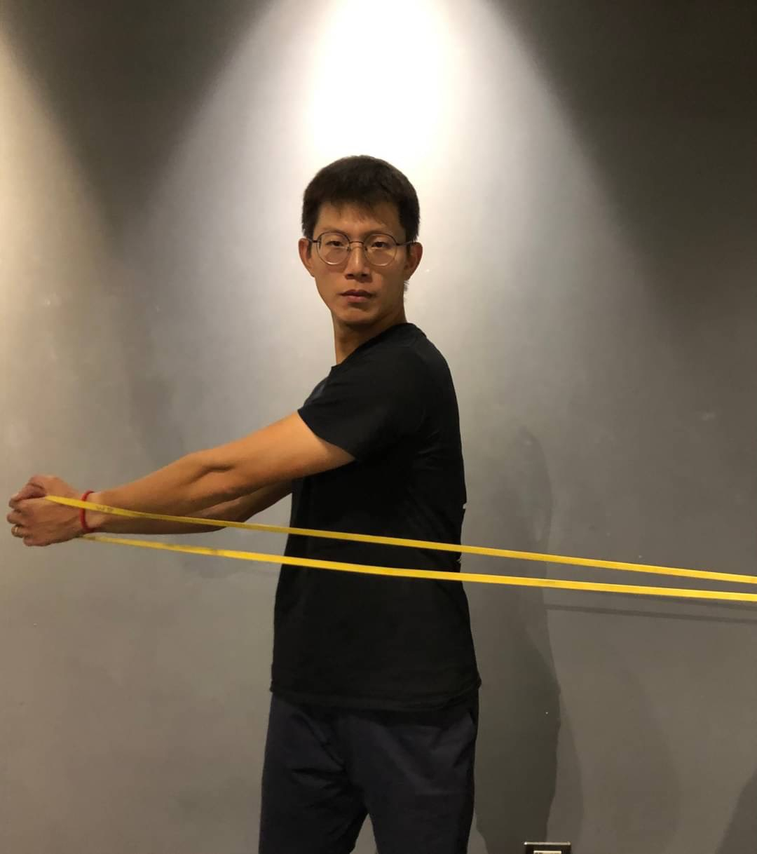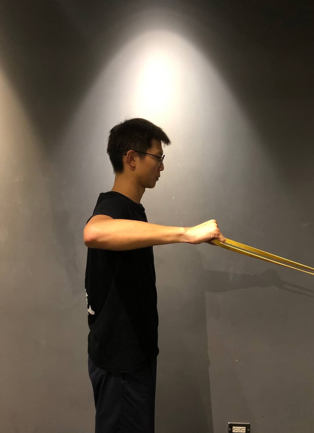 - 保持身體直立,將手肘舉起平行地面,手握住彈力帶,在起始的位置在身體正前方。