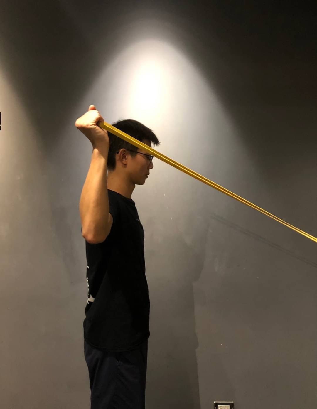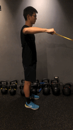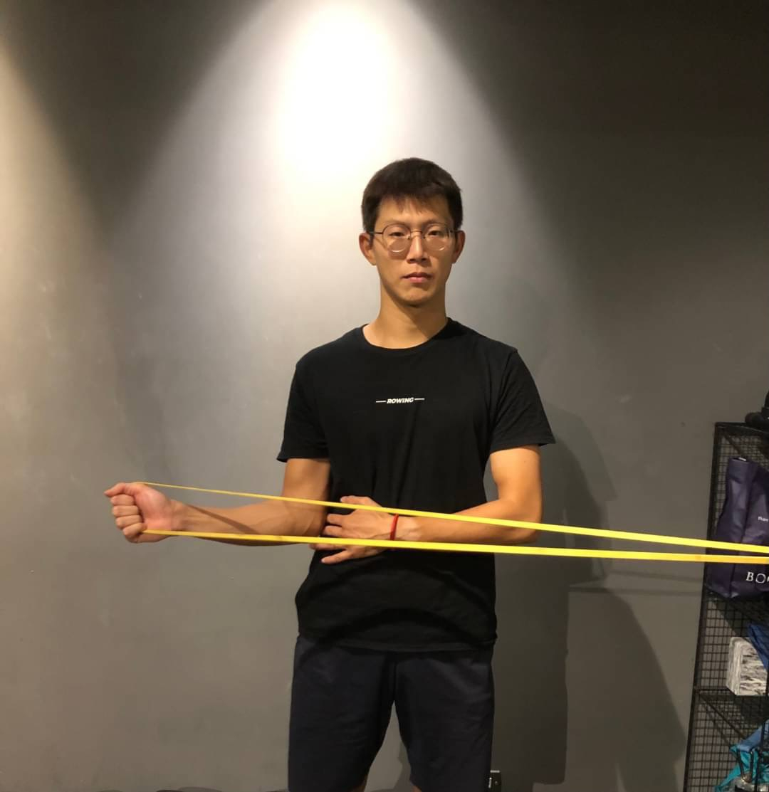 - 保持身體直立,將手肘舉起與肩同高,手肘呈現 90 度,起始位置手肘平行地面,手握住彈力帶。