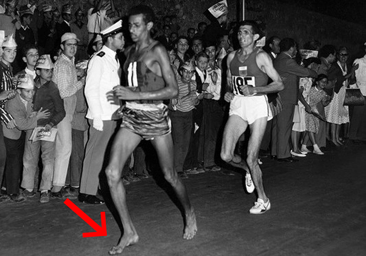 1960年奧運馬拉松冠軍 Abebe Bikila 因為賽前沒有適合的鞋子選擇赤足,最後還是奪冠