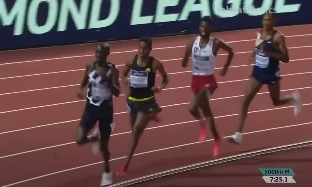 佛羅倫斯站跑道內側沒有配速燈號,鳴槍起跑後配速員以 2:35/k 的速度前進,比 Chepetegei 世界紀錄的配速約慢 4-5秒/k,全部的選手以一條人龍陣型緊跟;2000m 後配速員下場,Chepetegei 領跑,將速度提升到每圈 60-61秒,約 2:32-33/k,衣索匹亞廿七歲的「沙場老將」 Hagos Gebrhiwet、加拿大雙箭頭 Mo Ahmed、Justyn Knight 跟上,形成四人集團以 7:44 通過 3000m。