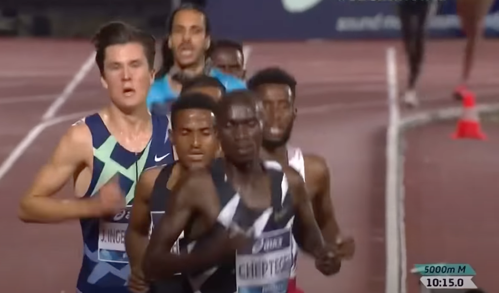 Cheptegei 稍微失速,包括 Jakob Ingebrigtsen 等兩、三人追上領先集團(圖片來源:Youtube)