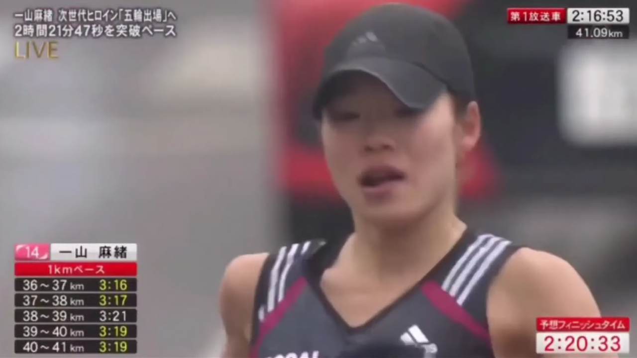比賽當天雖然跟 2019年東京馬拉松一樣下雨,但是雨勢沒有那麼大,加上温度有9度,所以也算適合破最佳的天氣。比賽前段以 3分20秒的配速去跑,以 1小時 10分 26分通過前半馬,25公里時第一集團大約有十位選手,但情況在 30公里發生變化,一山麻緒衝出了一波 16分14秒的 5公里,在 35-40公里也有 16分31秒,36-41公里每公里分別是 3分16秒、3分17秒、3分21秒、跟兩個 3分19秒,雖然幾乎肯定可以達標,但她也不敢鬆懈,因為未到最後一刻都還有很大變數。