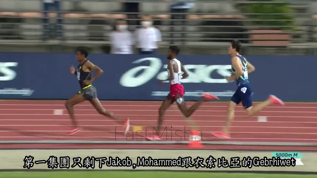 而 Mohammed 雖然 5000公 尺也有 12分 47秒,但 2000 公尺 5分整、1500 公尺 3分 34秒都是完全落後於 Jakob 的 3分 28秒 1500公尺跟 4分 50秒的 2000公尺,在速度上 Jakob 可說是屌打另外兩位。不出所料,最後一百公尺完全是 Jakob 主宰,最後以 12分 48秒刷新了歐洲紀錄。Gebrhiwet 跟 Mohammed分 別是第二跟第三。而 Cheptegei 則以 12分 54秒全場第六完成。