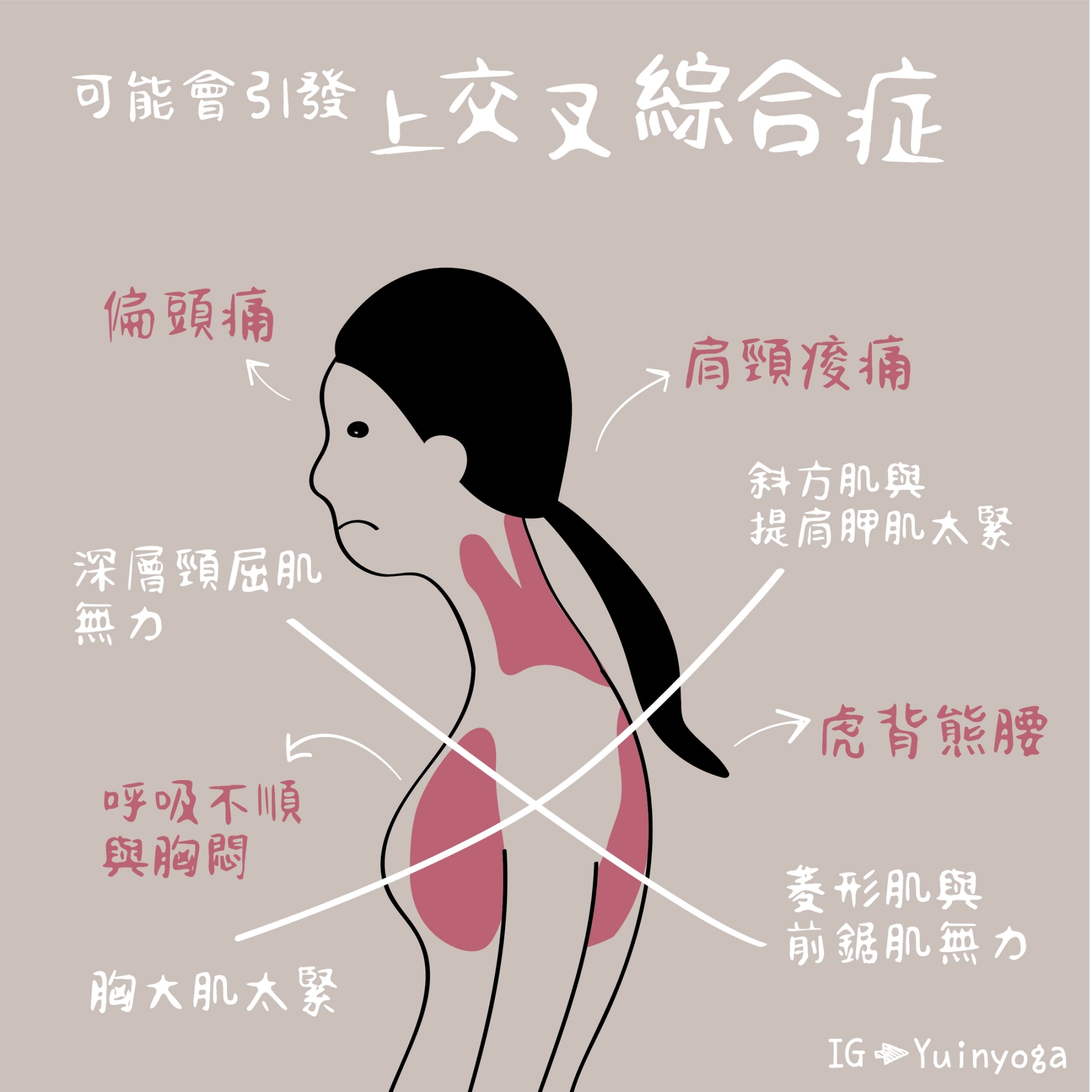 姿勢不良可能會引發「上交叉綜合症」,並出現各種痠痛的症狀