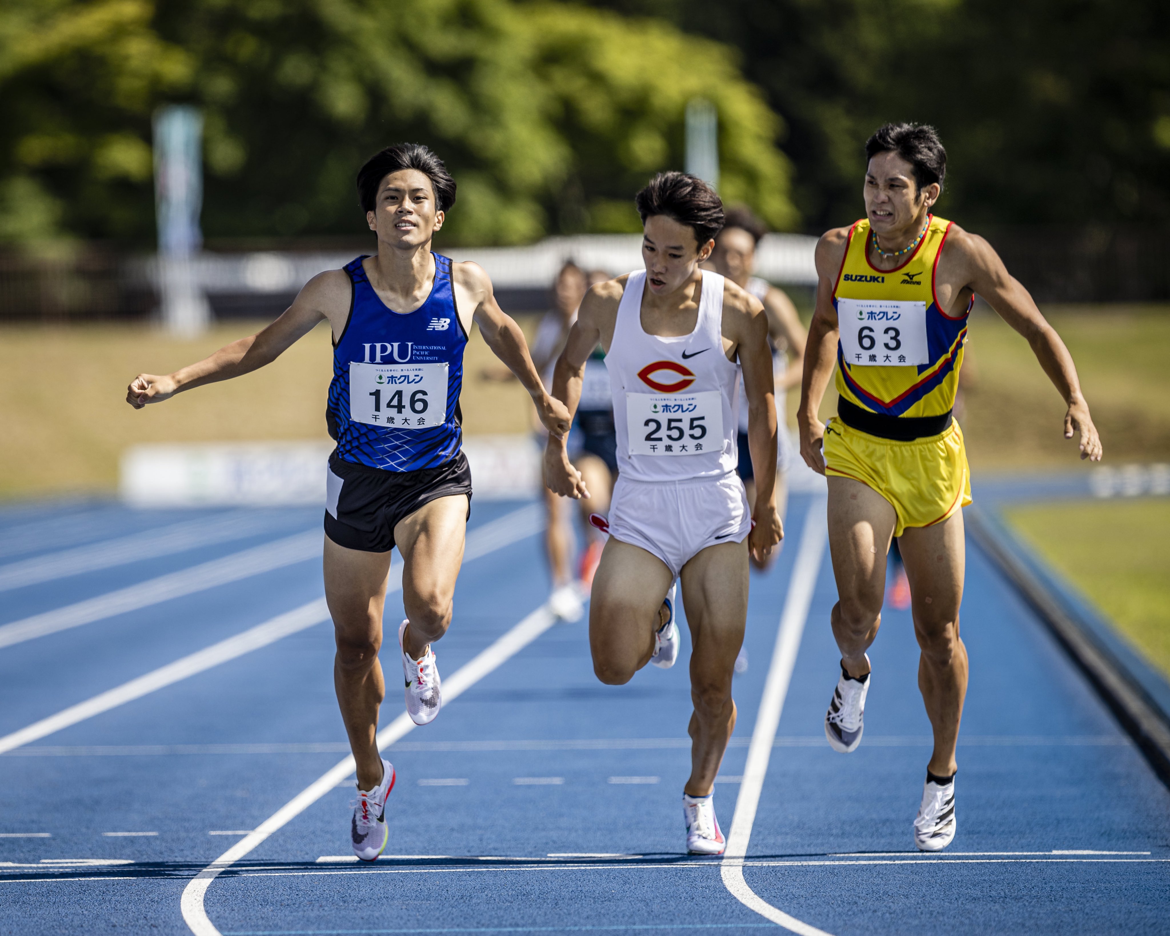 源裕貴在 800 公尺以 1:45.75 追平全國和大學紀錄(左)!兩項紀錄保持者 川元獎(右)以 1:45.83 拿下第二;金子魅玖人(中)則以 1:45.85 拿下第三。