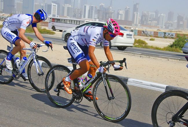 加入「藍波美利達」的馮俊凱,在 2015 環杜拜第二站,成功突圍超過100公里