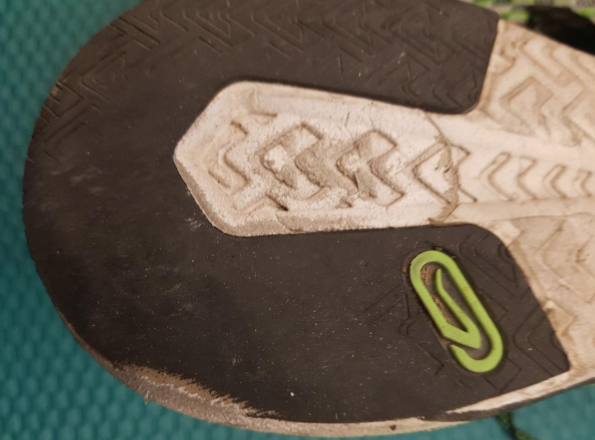 雖薄底卻不耐磨140K左右可以看到鞋底腳跟外緣凹槽處已經磨平,甚至露出中間層的白色膠,可能筆者跑姿後足跟著地有關係,對於前足著地的跑者或許會比較耐磨。