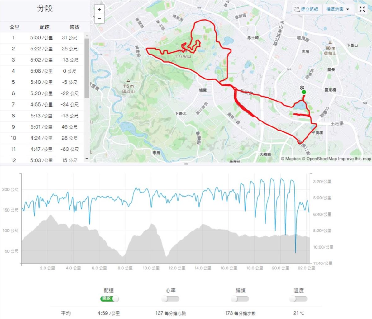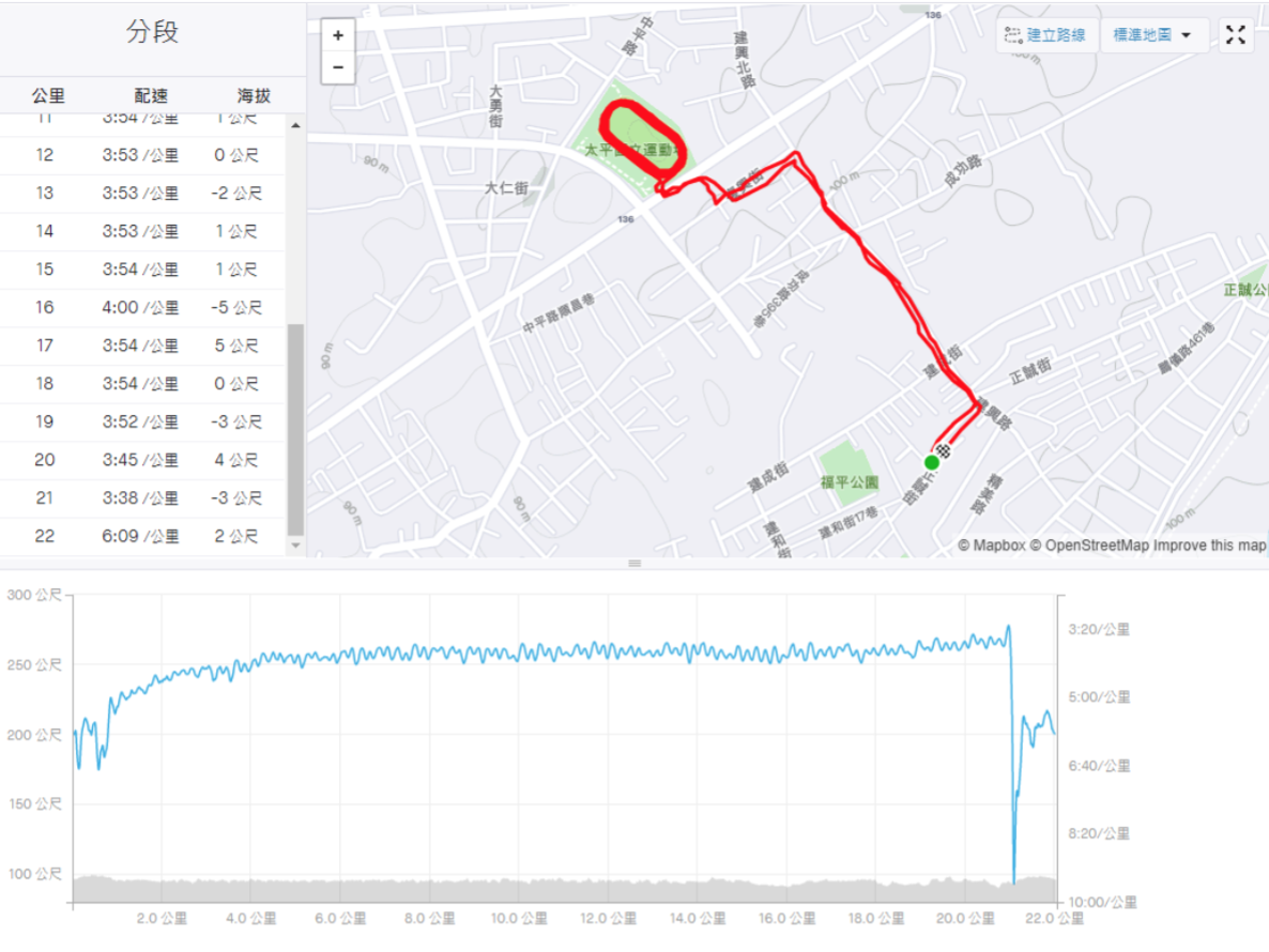 原本是要跑一個帶有上下坡度混合直線的 EZ,後來因為還有充分的練習時間,加碼約 350M 緩上坡的 6 趟間歇。帶著有點疲勞的大腿,瞬間的加速能力也沒有受到影響,可以快速到位,薄底鞋在速度提升能力還是能夠穩穩地發揮出來。