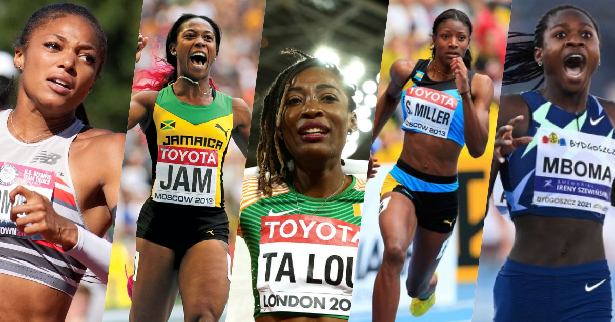 Thompson Herah 的雙金之路的挑戰者,從左而右依序為:Gabby Thomas、Shelly-Ann Fraser-Pryce、Marie-Josee Ta Lou、Shaunae Miller-Uibo,以及 Christine Mboma