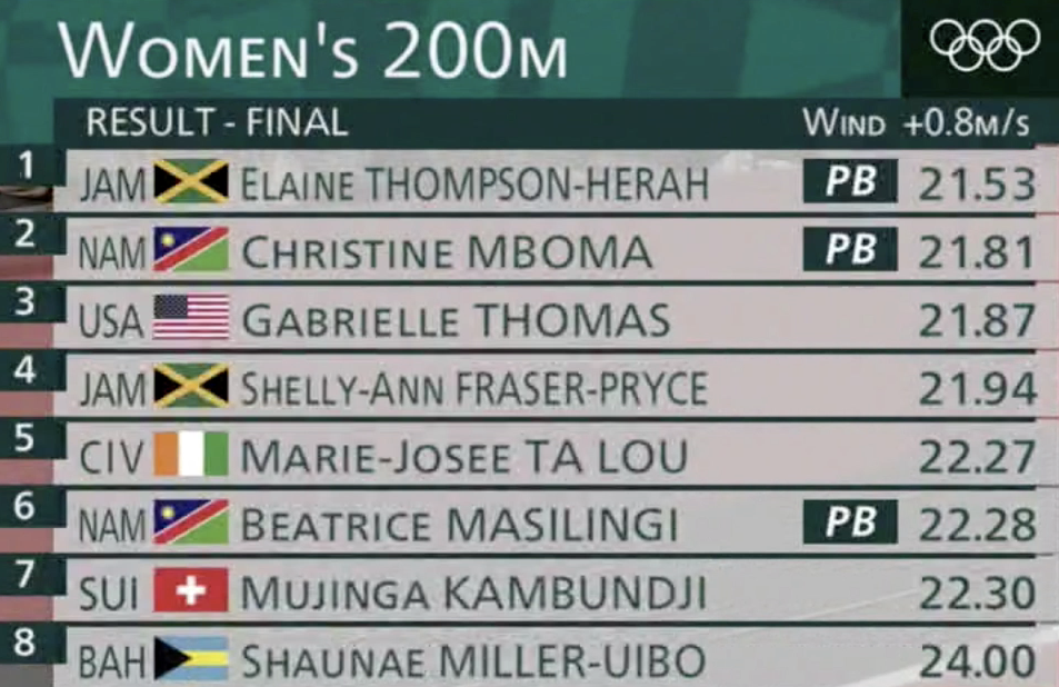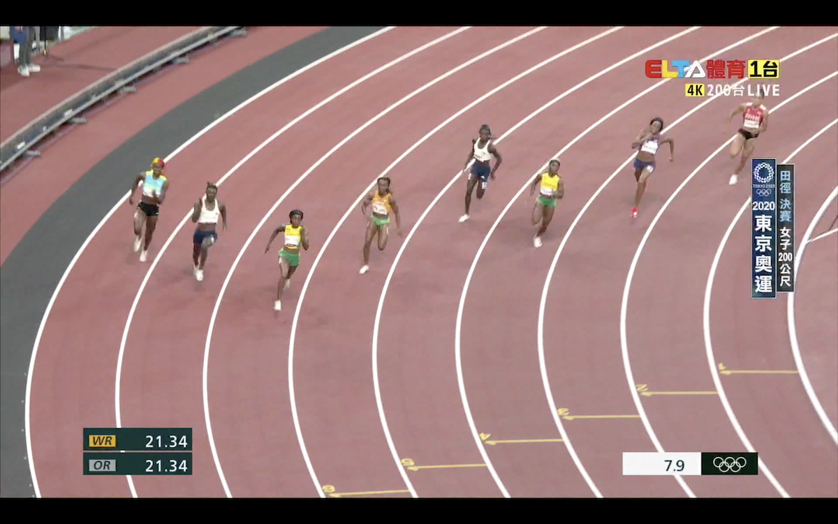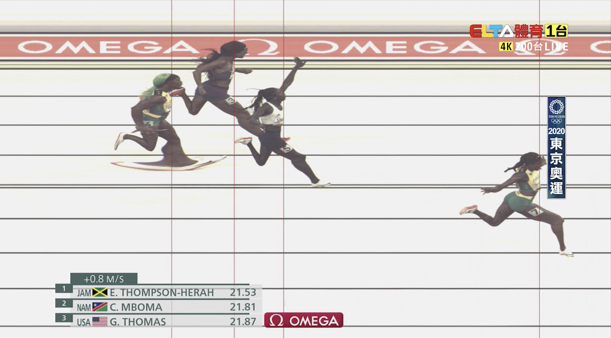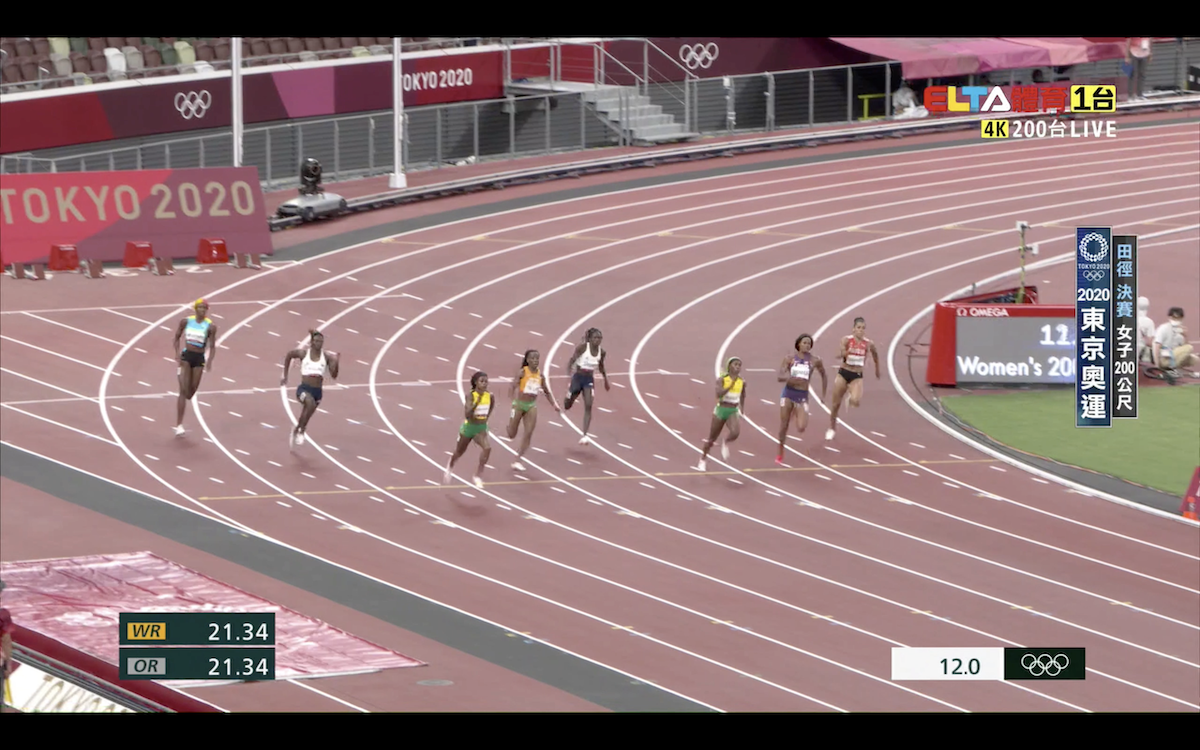 這次女子200公尺決賽,從第二到九道依序是:瑞士的 Mujinga Kambundji、美國 Gabrielle Thomas、牙買加「閃電媽媽」Shelly-Ann Fraser-Pryce、納米比亞 18歲小將 Christine Mboma、象牙海岸名將 Marie-Josée Ta Lou、尋求雙料金牌的牙買加名將 Elaine Thompson Herah、納米比亞 Beatrice Masilingi,以及里約奧運 400m 金牌的巴哈馬 Shaunae Miller-Uibo。