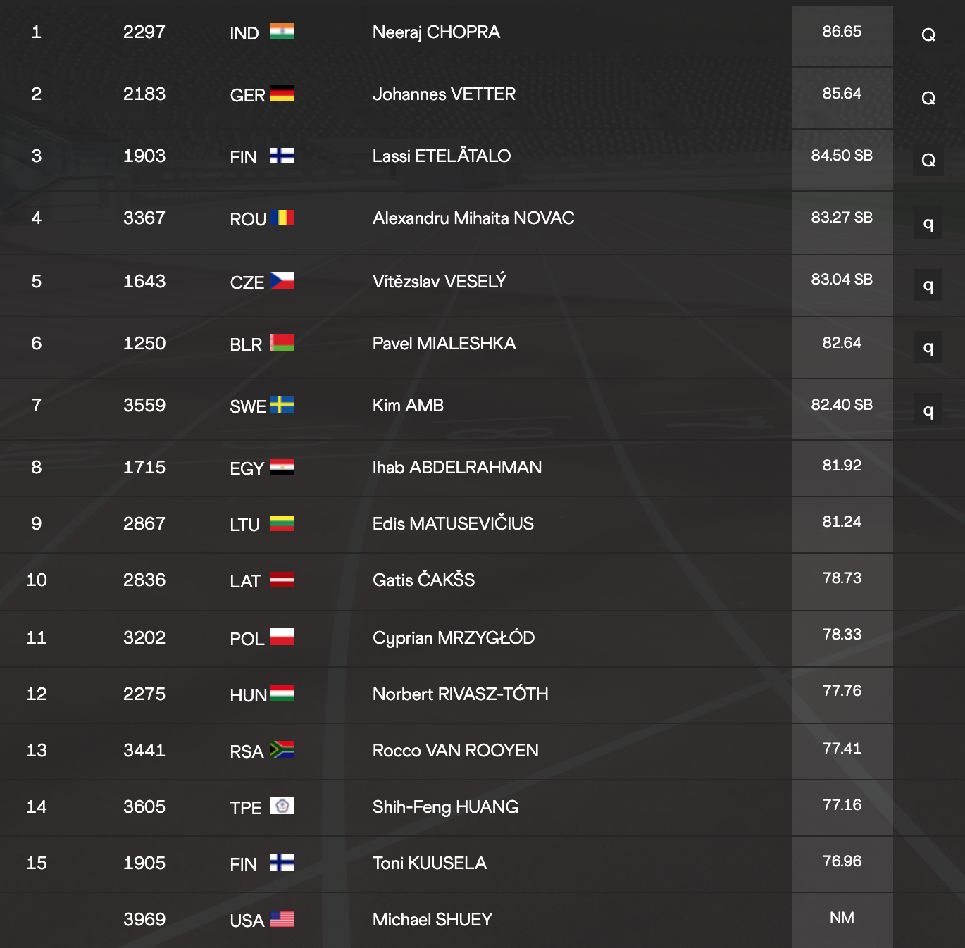 兩人表現不如預期目標,黃士峰在第一組三次投擲以 77.16m 在 A 組排行第 14 名;鄭兆村以 71.20m 排 B 組第 15 名,兩人都無緣決賽。