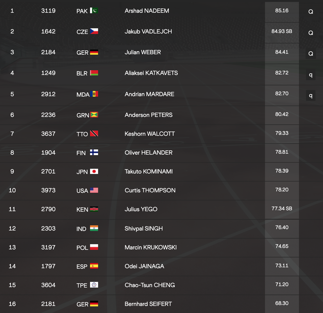 首次參加奧運的鄭兆村,2017 年在世大運擲出 91.36m 的亞洲紀錄,高居世界歷代第 13 傑,近年來在鑽石聯賽也有穿金戴銀的表現,是被寄予厚望的奪牌希望,在 B 組登場三次試擲,成功兩次的成績為 68.18m、71.20m,分組第 15 名也無緣決賽。