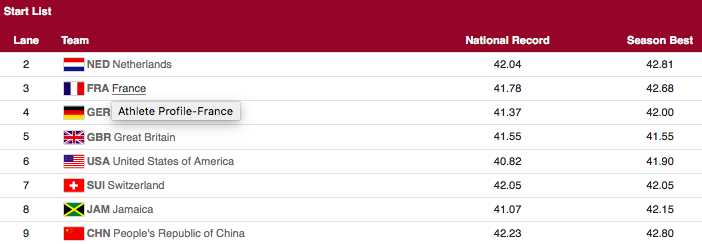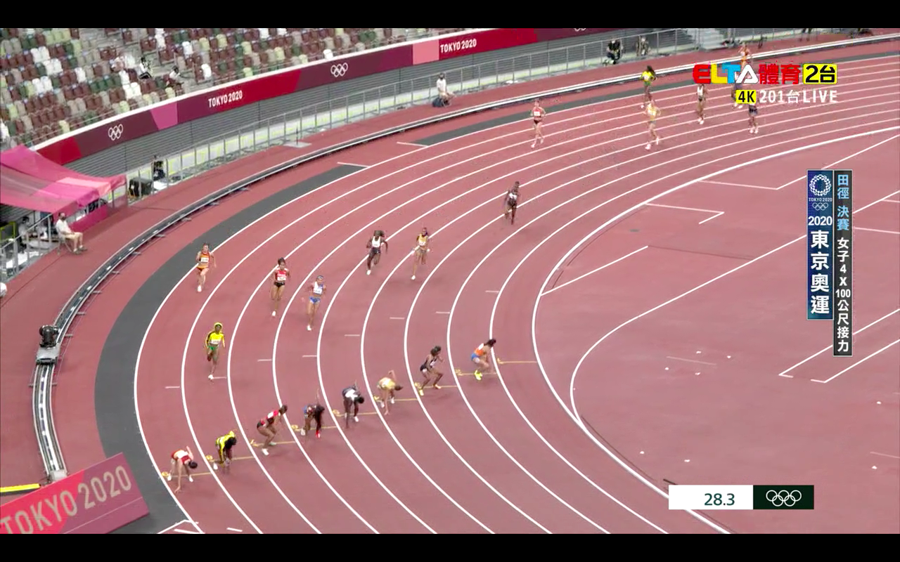 4 x 100m 因為距離較短沒有像 4 x 400m 有較大的容錯空間,所以在起跑傳接棒的流暢度,將會是影響比賽的關鍵。槍響起跑,可以看到牙買加選手 Briana Williams 有著相當不錯的起跑。