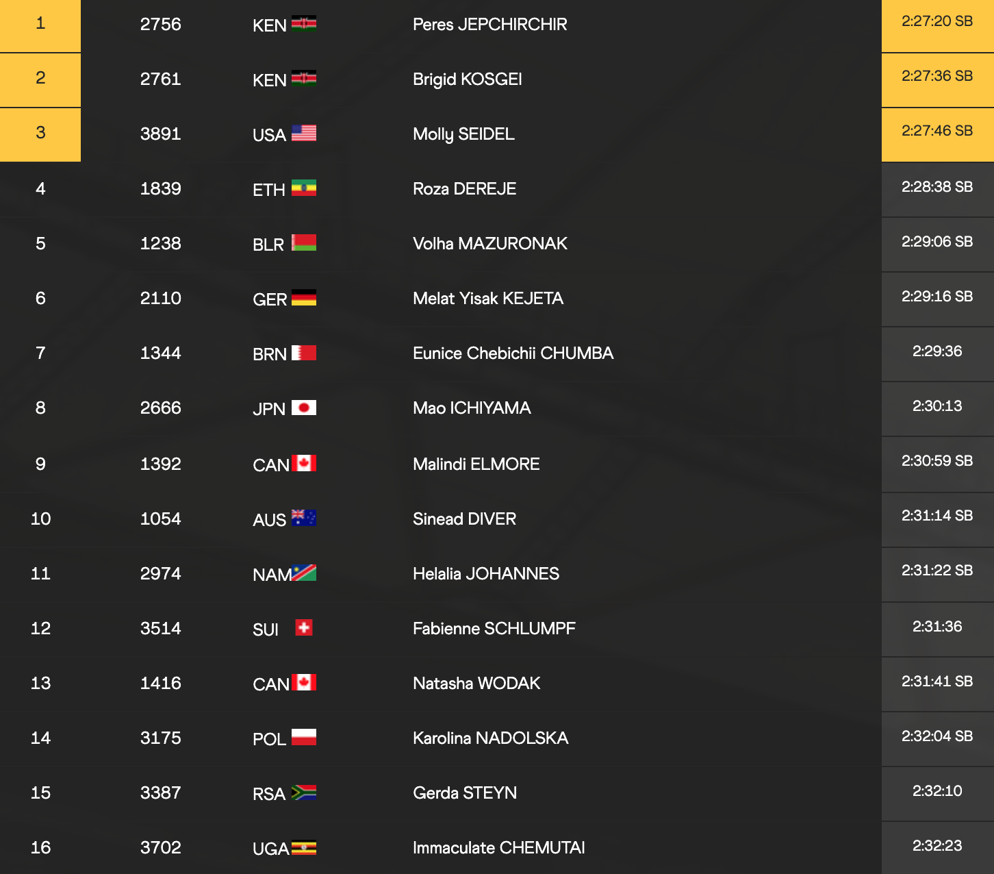 最終 Peres Jepchirchir 2:27:20、Brigid Kosgei 2:27:36、Molly Seidel 2:27:46 先後完賽獲得金、銀、銅牌,三人後半程都在 72 分左右,比前半成 75 分快上 2 分半以上,全體完賽選手也只有八位以前慢後快完賽。