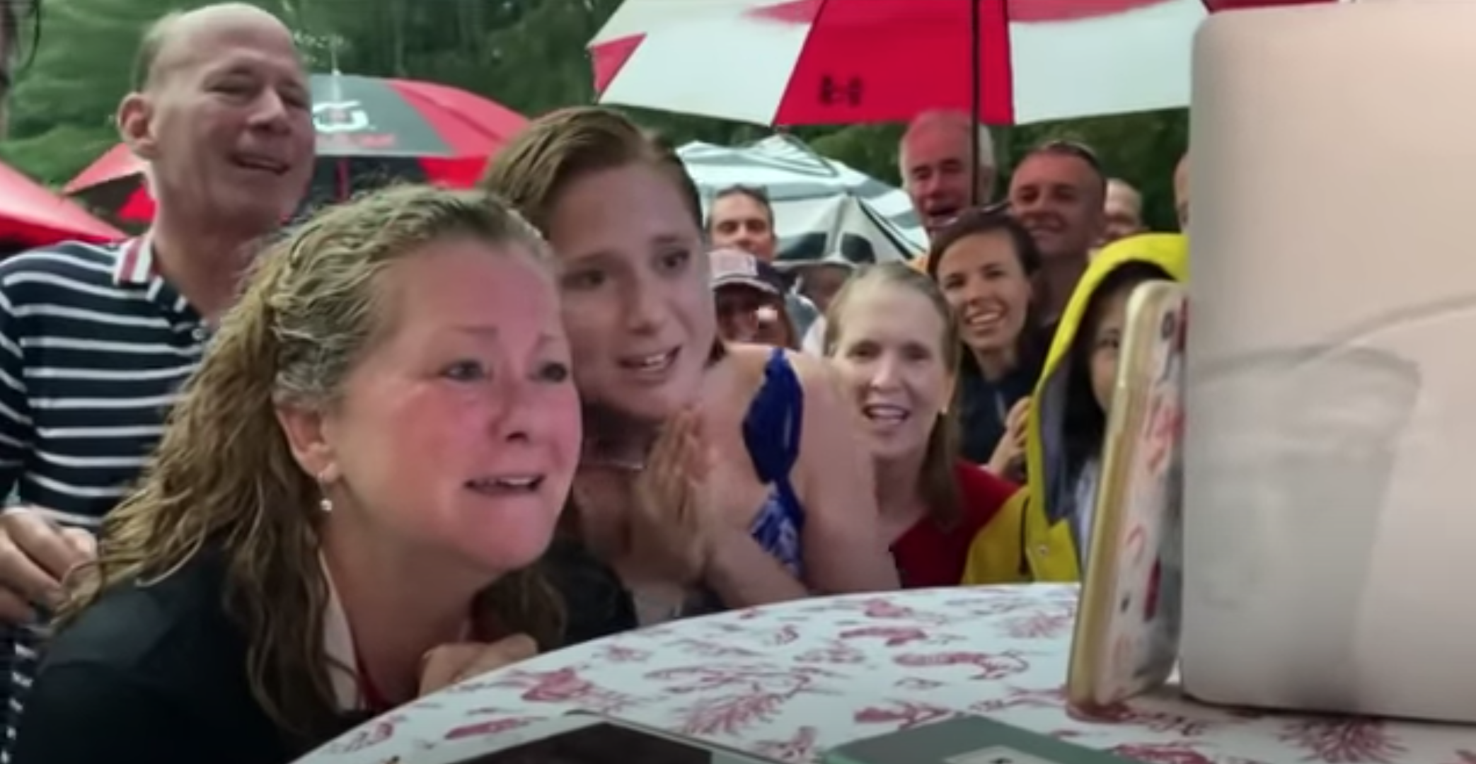 在美國與剛完賽的 Molly Seidel 視訊的父母、親朋好友(圖片來源:Youtube)