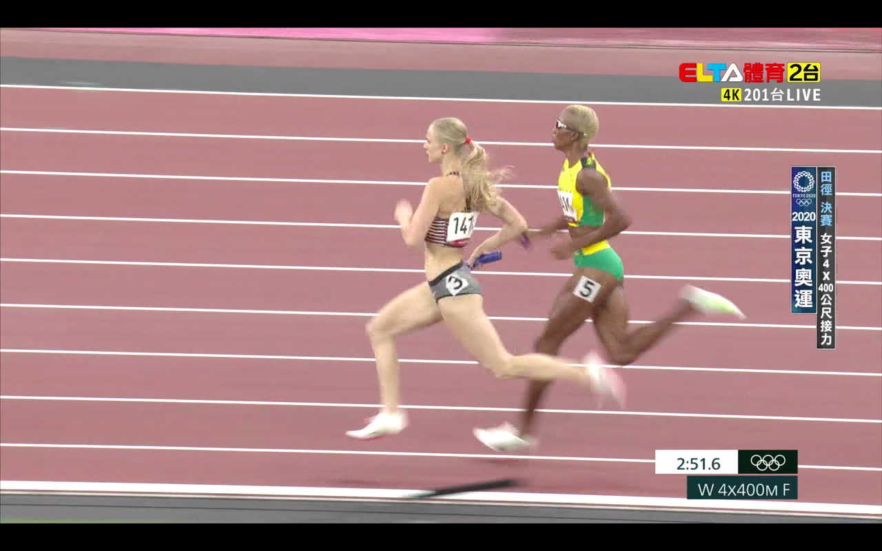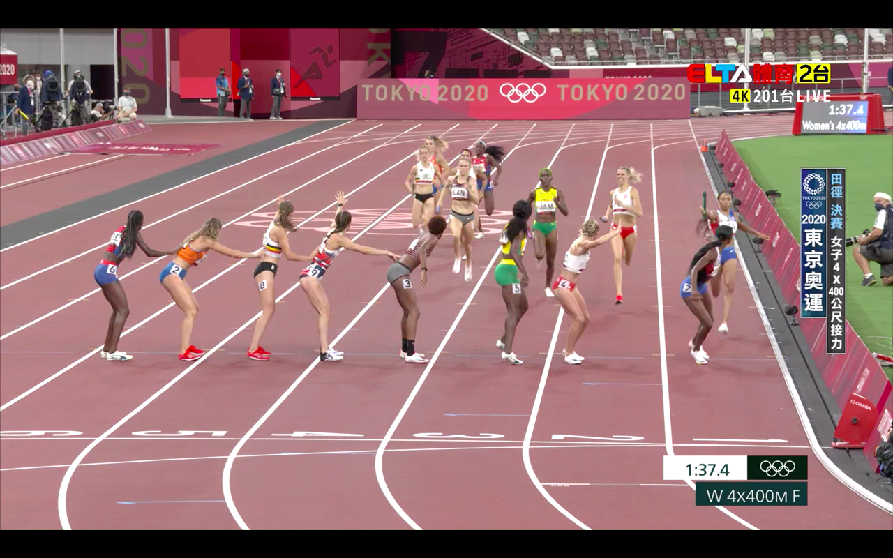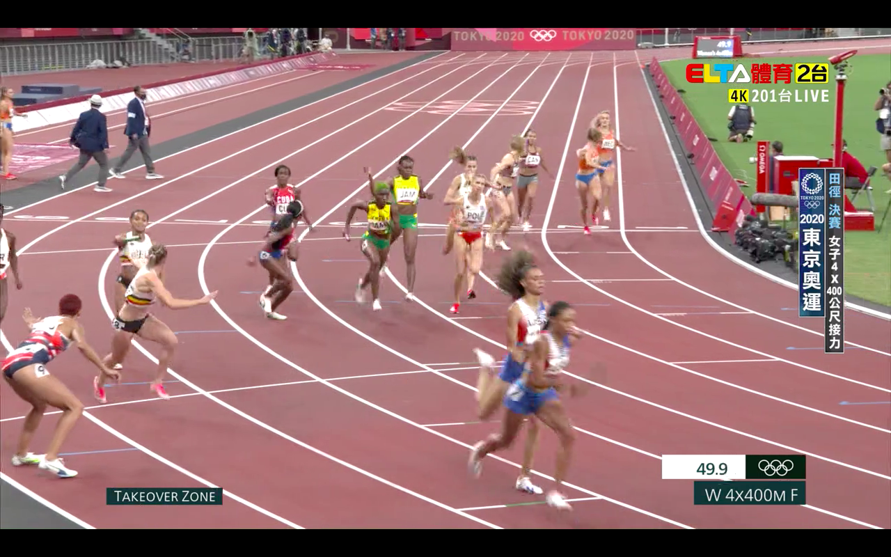 來到關鍵第三棒,美國隊 Dalilah Muhammad 以飛快的速度拉開了與後面的差距,將棒子交給了年僅 19 歲的小將 Athing Mu 也是今年女子 800m 項目金牌得主,前面 Dalilah Muhammad 所創造的優勢幾乎讓美國隊鎖定了金牌。