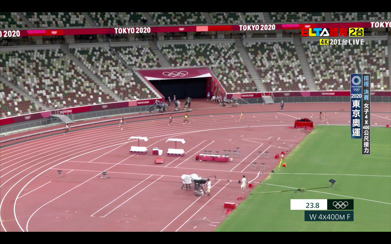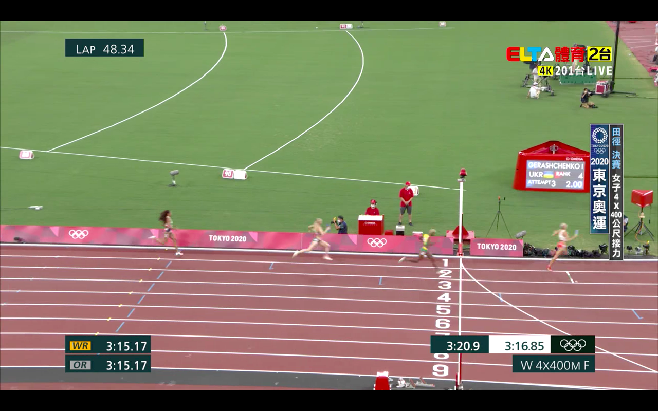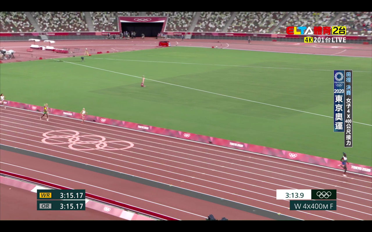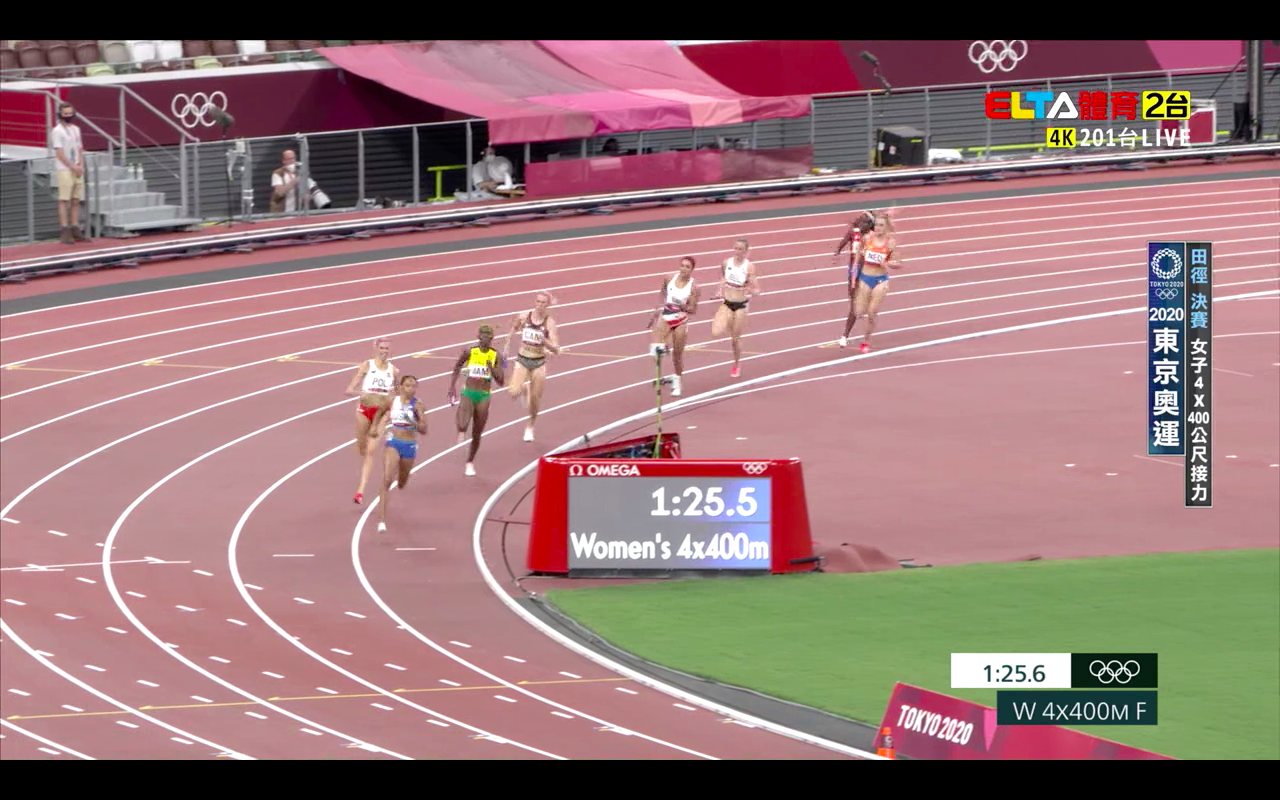 來到關鍵第三棒,美國隊 Dalilah Muhammad 以飛快的速度拉開了與後面的差距,將棒子交給了年僅 19 歲的小將 Athing Mu 也是今年女子 800m 項目金牌得主,前面 Dalilah Muhammad 所創造的優勢幾乎讓美國隊鎖定了金牌。