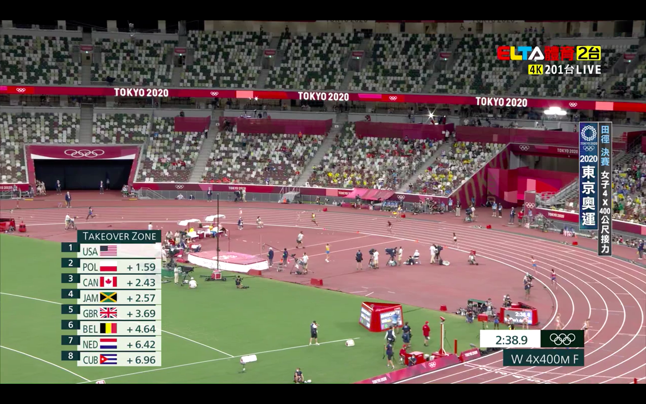 波蘭第二棒 Iga Baumgart-Witan 在搶完跑道後,拉近了與美國隊的差距!Allyson Felix 交棒,而波蘭、牙買加、加拿大也幾乎同時完成了交棒,前四差距此時非常有限。