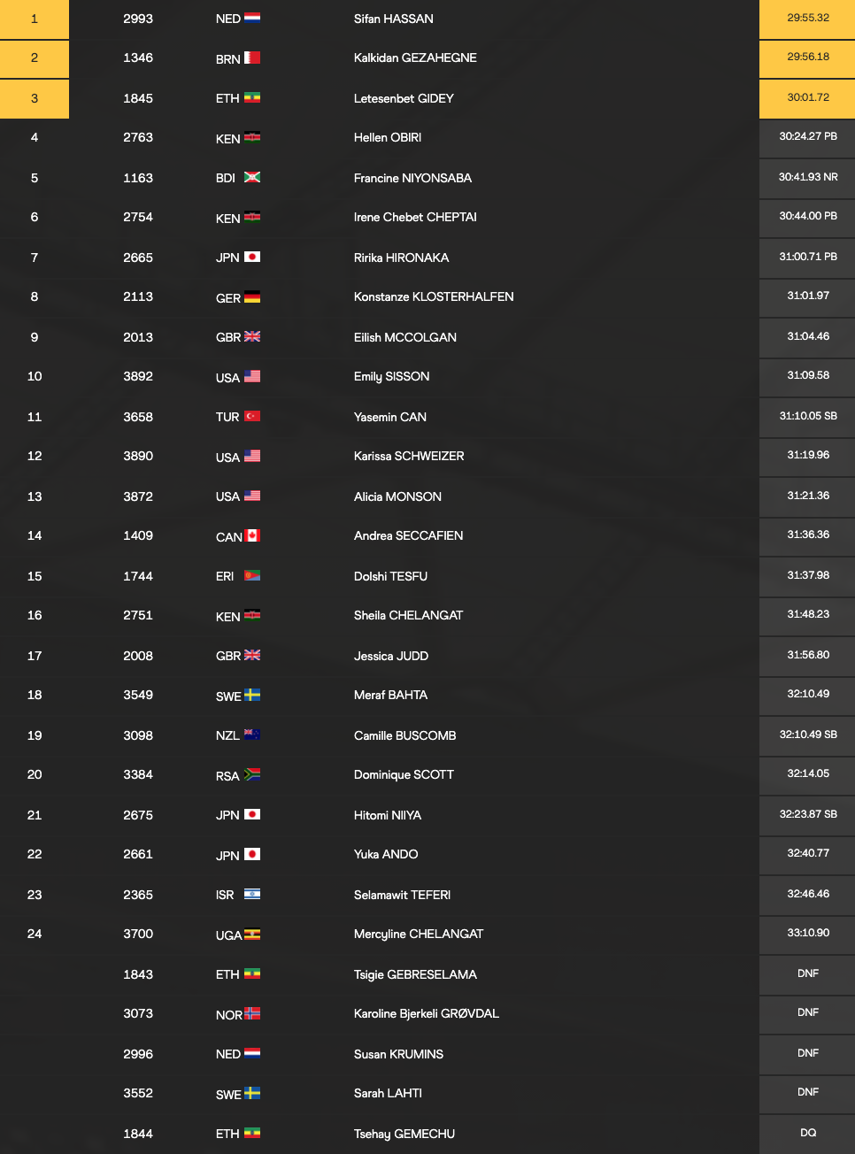 在沒有任何人追上來的情況下,三人進入最後一圈,無論 Gidey 怎麼加速都甩不開 Hassan、Gezahegne,她們緊緊吸著在側後方蠢蠢欲動,直到進入最後直道 Hassan 才超車拔腿狂奔,最後 100m 開了 13.6 秒,29:55.32 拿下本屆第二面金牌!