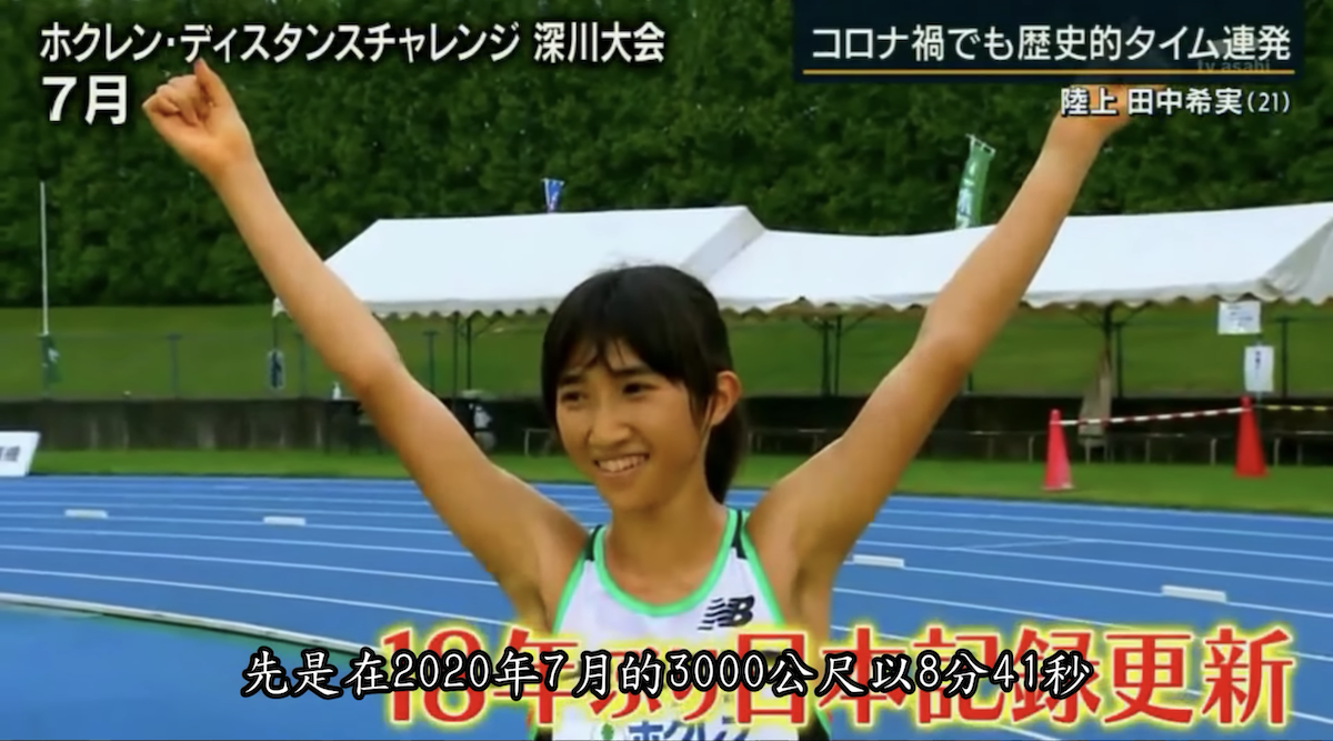 田中希實在 2020 年 7 月的 3000 公尺以 8 分 41 秒刷新了日本名將 福士加代子 保持了 18 年的日本紀錄