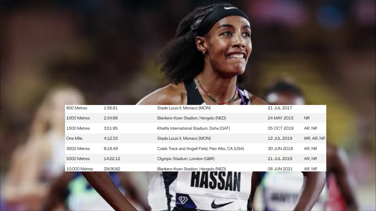 Hassan 是一個很特別的選手,因為她是從 800 公尺到半馬都擁有世界頂尖水平的選手,800 公尺 1 分 56 秒;3000 公尺、1 英里、10000 公尺都排在世界歷代前五傑;5000 公尺 14 分 22 秒;半馬 1 小時 5 分 15 秒等等......。