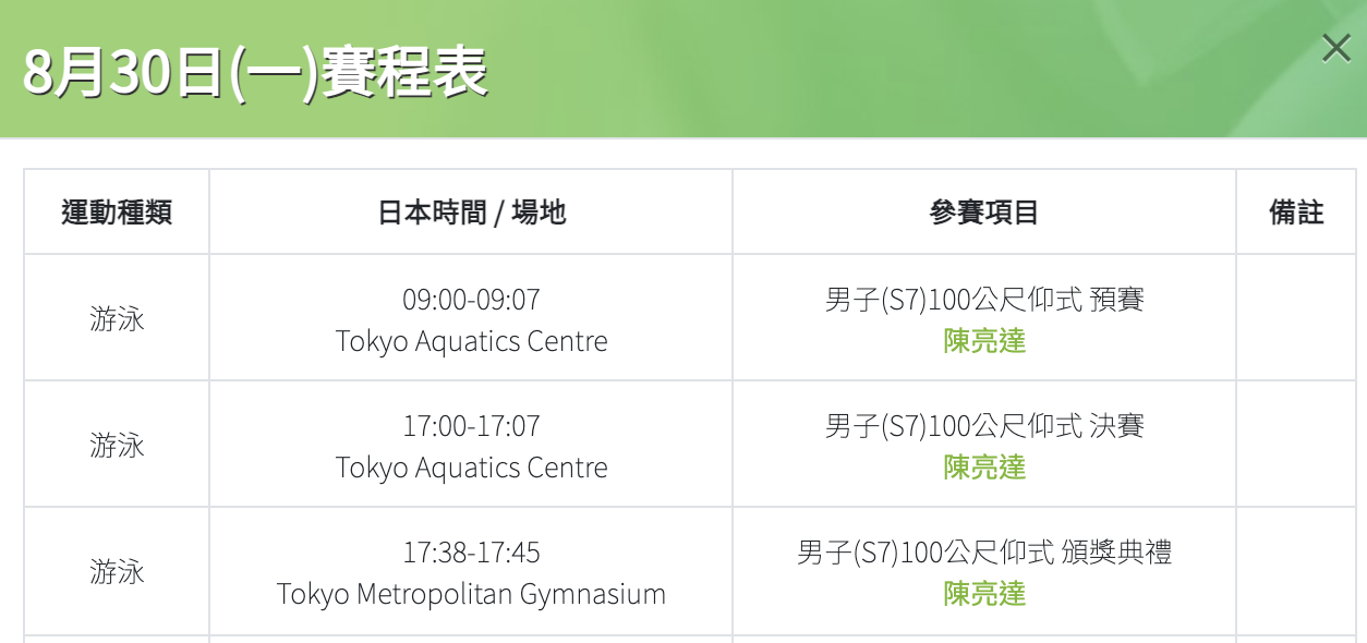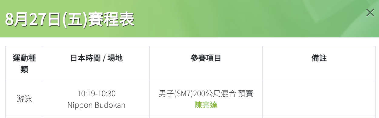 2020 東京帕運台灣選手 陳亮達 游泳賽程一覽