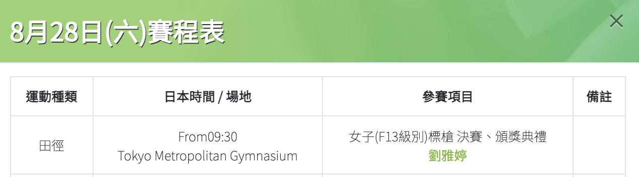 以上是這次的帕運田徑介紹,而楊川輝的男子 T11 級別跳遠決賽將於 8/27(五)展開,隔天 8/28(六)將是劉雅婷的女子 F13 級標槍決賽,讓我們繼續幫台灣好手加油!