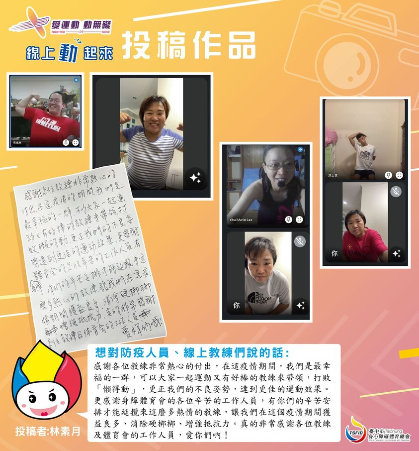 線上運動的需求因居家防疫而增加,學員從 80 人增加為 120 人,任選課程現也增為15 堂課,身心障礙者有更多時段可以運動,也有更多樣的運動選擇,台中指導團化危機為轉機帶來意想不到的成果。