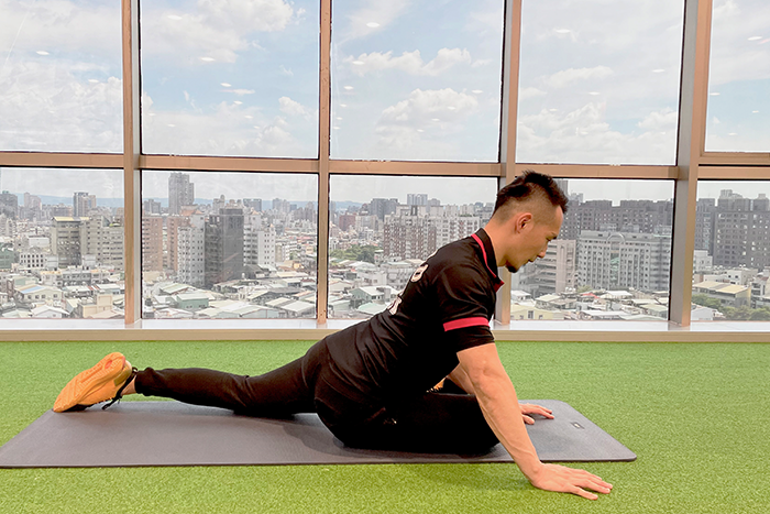 雙手撐地,單腳彎曲,收至緊腹部下方,骨盆不歪斜,上半身下壓,停留五個呼吸後換邊。