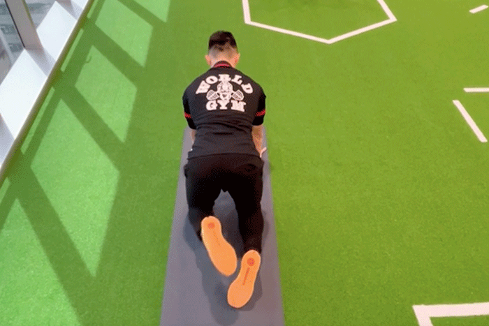 圖/World Gym Blog如果骨盆無法保持與地面平行,大腿可離開地面,在大腿下方墊瑜珈磚、厚毛巾(紅色方框區域),重點在於保持骨盆不歪斜。