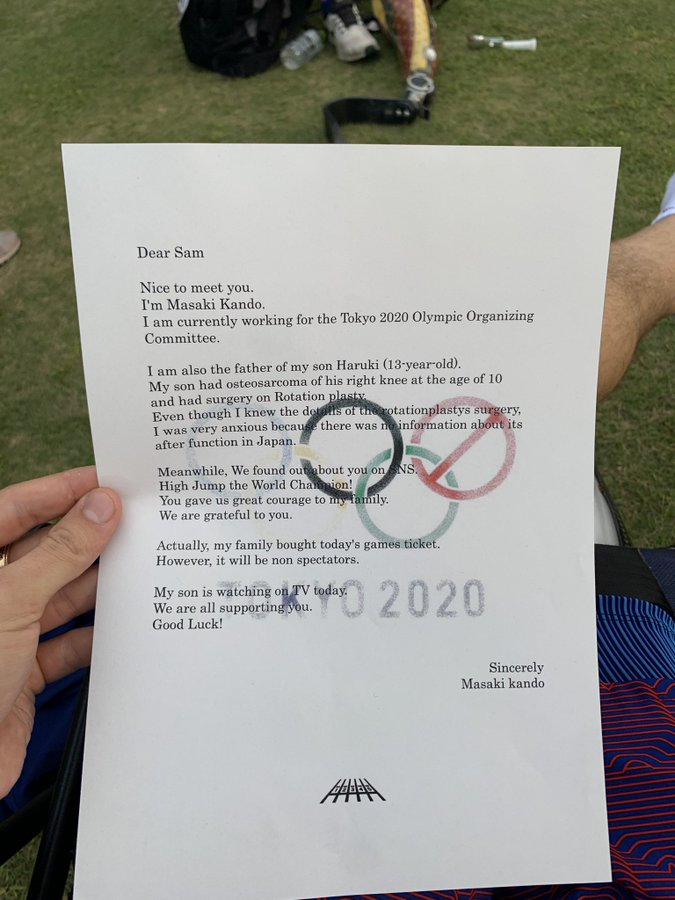 「當時我剛下公車,走在前往賽道的路上,一位當地的日本人遞給了我一張便條,上頭說到他兒子在 10 歲時也被診斷出與我相同的疾病,但在看到我的比賽後,他們對於截肢後的可能性與能力是多麼的令人難以置信,而他的兒子也做出了同樣的決定,現在他正在上中學並踢著足球。」