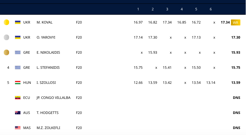 因為 Ziyad 被判 DNS 成績作廢,烏克蘭選手 Koval 的 17.34m 成為了世界紀錄。 圖/帕奧官網