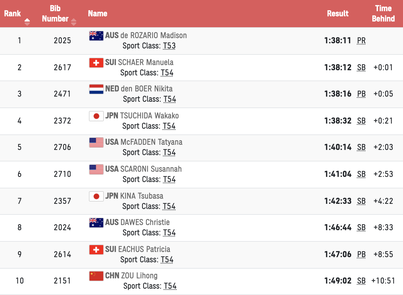 澳洲 Madison de Rozario 最後衝刺,以 1:38:11 打破帕運紀錄奪金!第二、第三名的落差都在 5 秒內,瑞士 Manuela Schar 以 1:38:12 摘銀;荷蘭 Nikita den Boer 以1:38:16 摘銅;土田和歌子最後以 1:38:32 拿下第四。